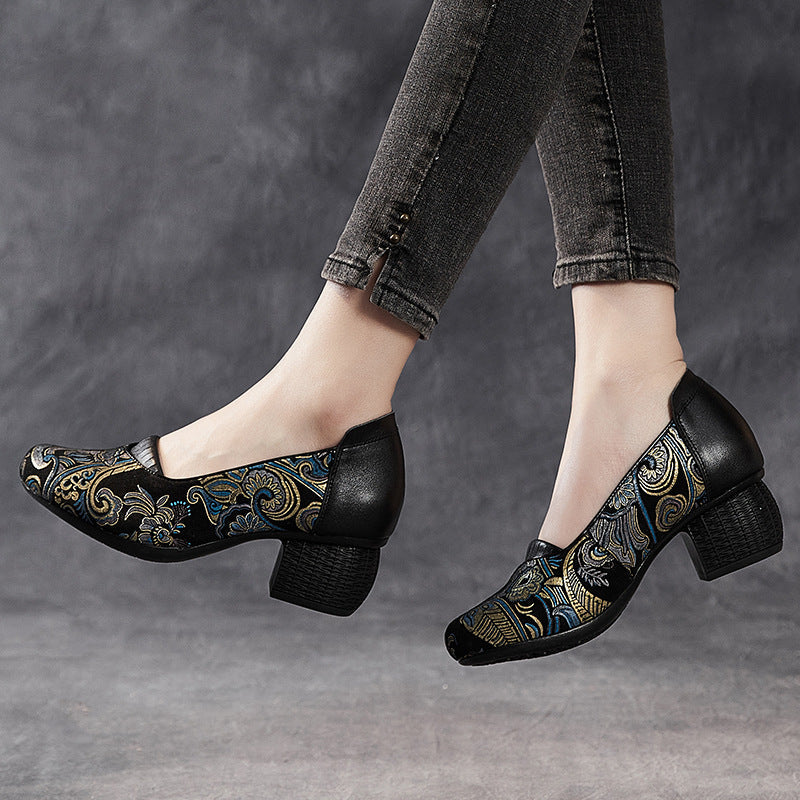 Beauty Real Leather National Wind Coarse And Shallow Print Comfortable Chinese Style Original Fashion Mother Shoes Lefu Shoes High Quality Shoes