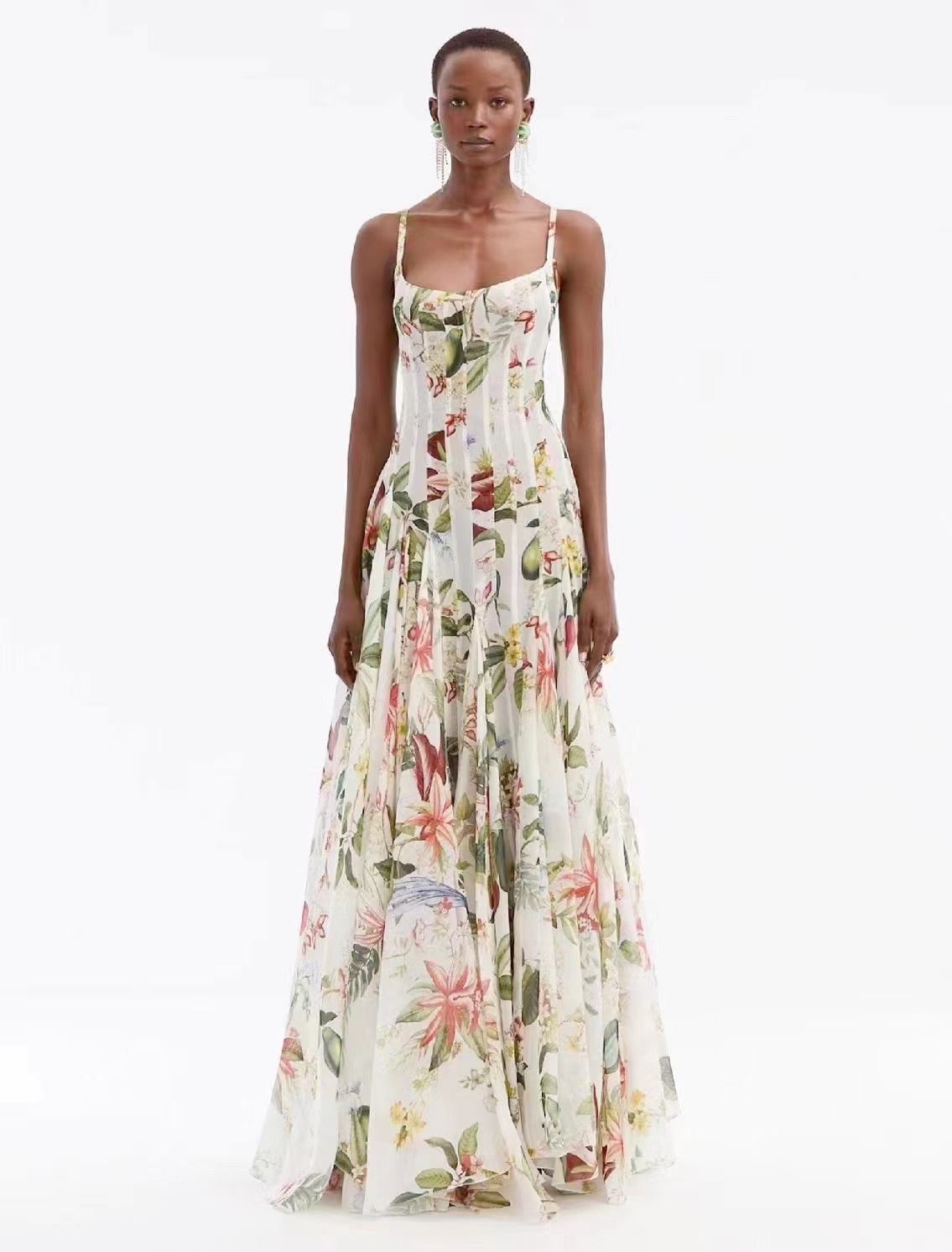 Niche 2024 Summer New Sling U Tie Sleeveless Print Waist Hollow Long Dress Woman