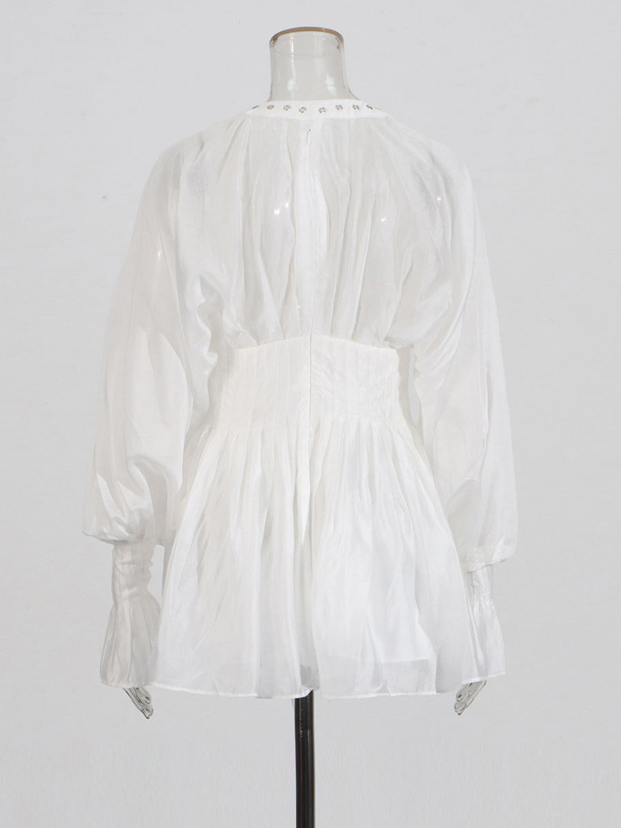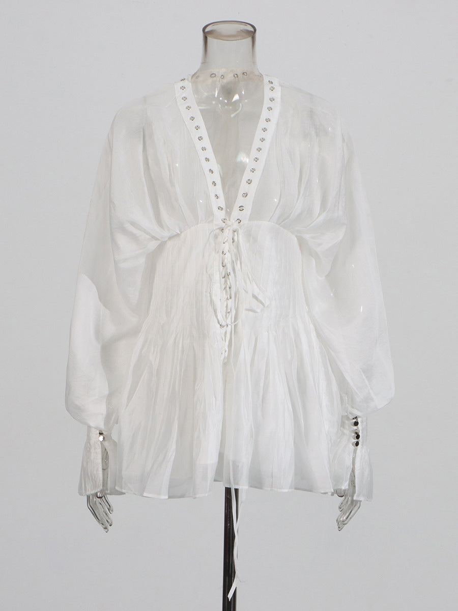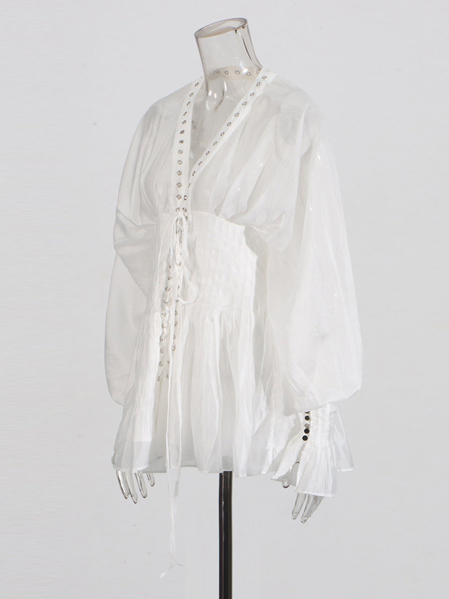 Niche Pure Lusty Fairy Dress 2025 Summer New Deep V Collar Lantern Sleeves Thin Tie Dress Dress Woman
