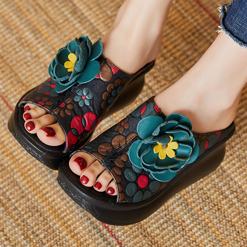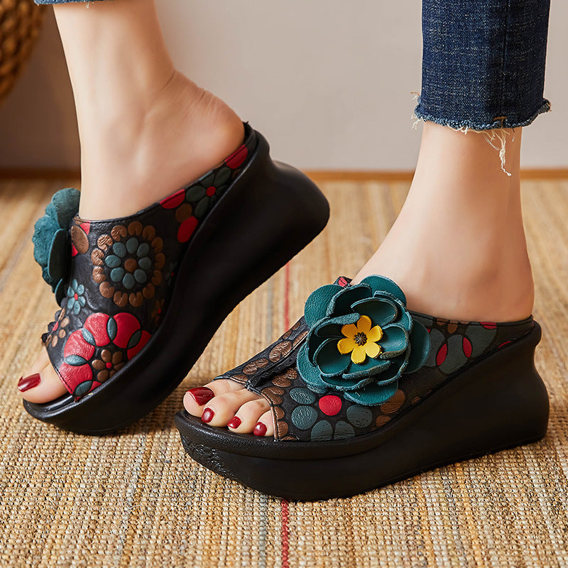 Of The Pig Skin National Wind Flower Print Big Flower Summer Retro Hollow Fish Mouth National Wind Drag High Quality Shoes