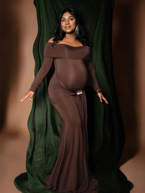 Off Shoulder Draped Ruched Metal Buckle Bodycon Elegant Maternity Photoshoot Maxi Dress Maternity