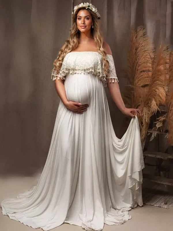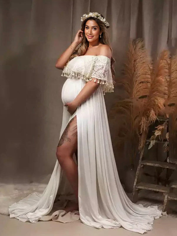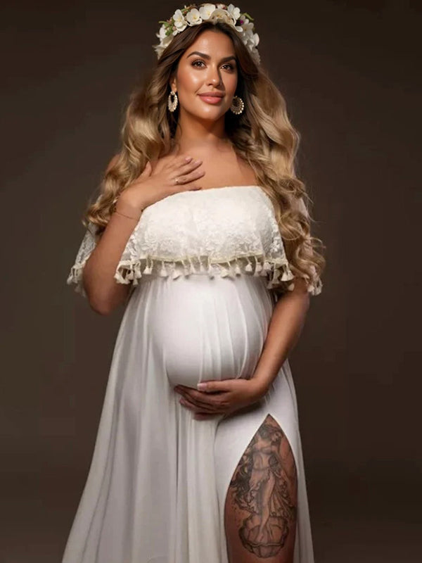 Patchwork Lace Tassel Slit Photoshoot Baby Shower Pregnant Maternity Maxi Dress Maternity
