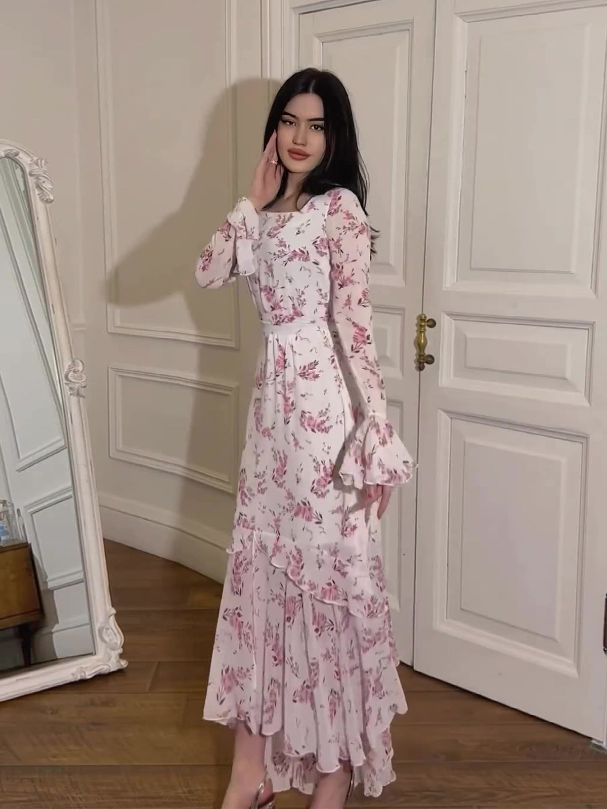 2024 Summer Chiffon Flower Leaf Sleeves Long-Sleeves Illustuff Irregular Dress