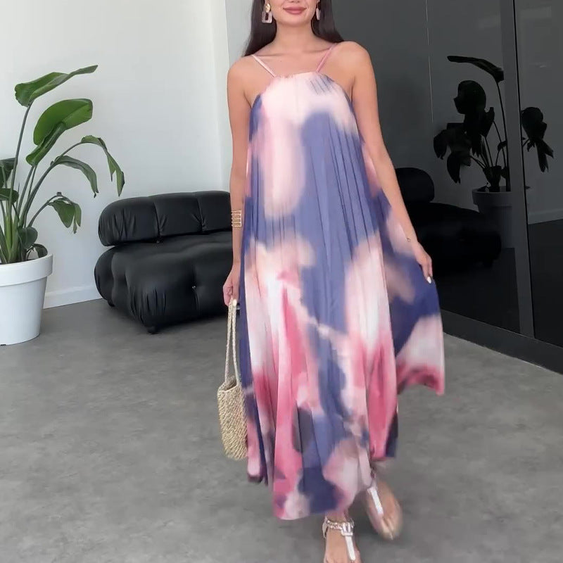 2024 Women's Sling Tie-Dye Purple Print Loose-Back Sexy Dress