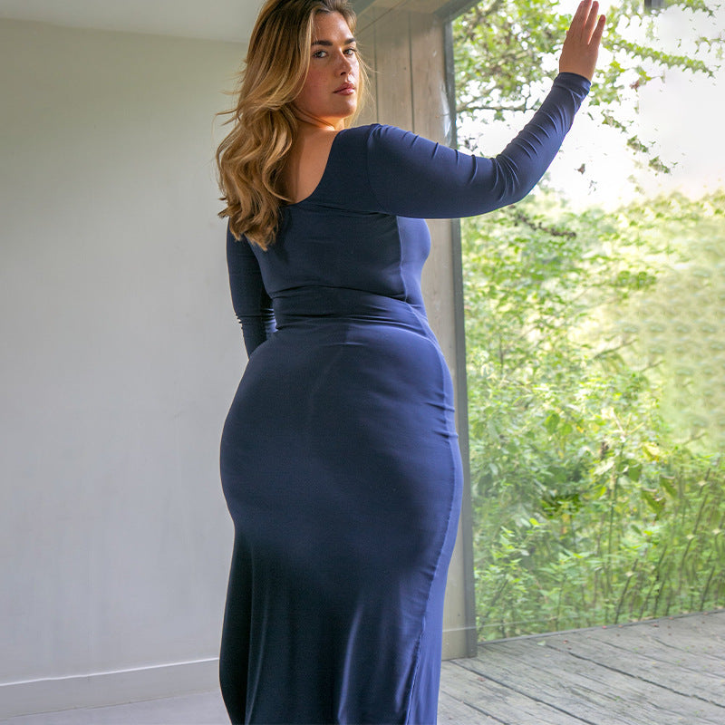 2025 New Solid-Color Long-Sleeved Bag-Pupled With Open-Fork Elastic Dress