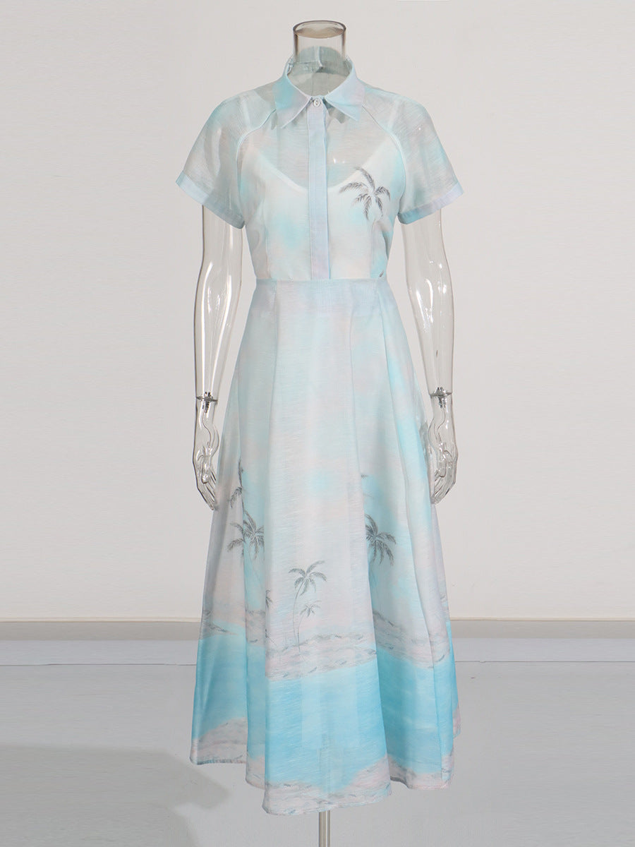 2025 Summer New V-Neck Print Short-Sleeved Shirt + High-Rise Half-Dress Suit Woman