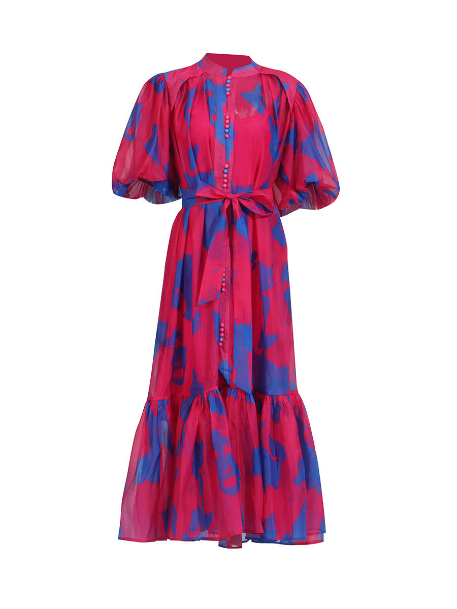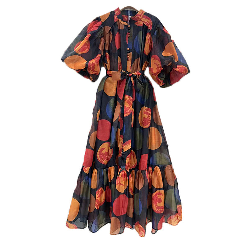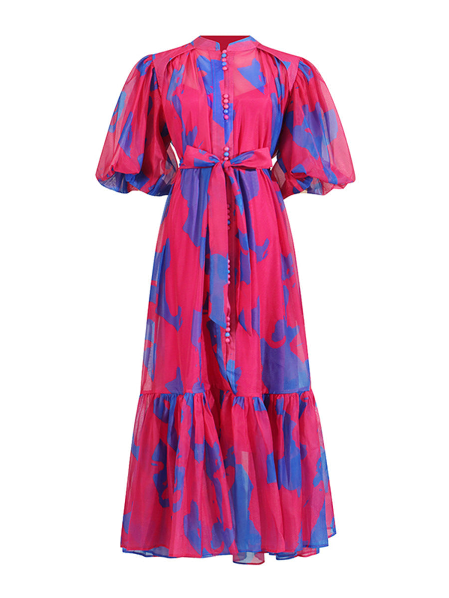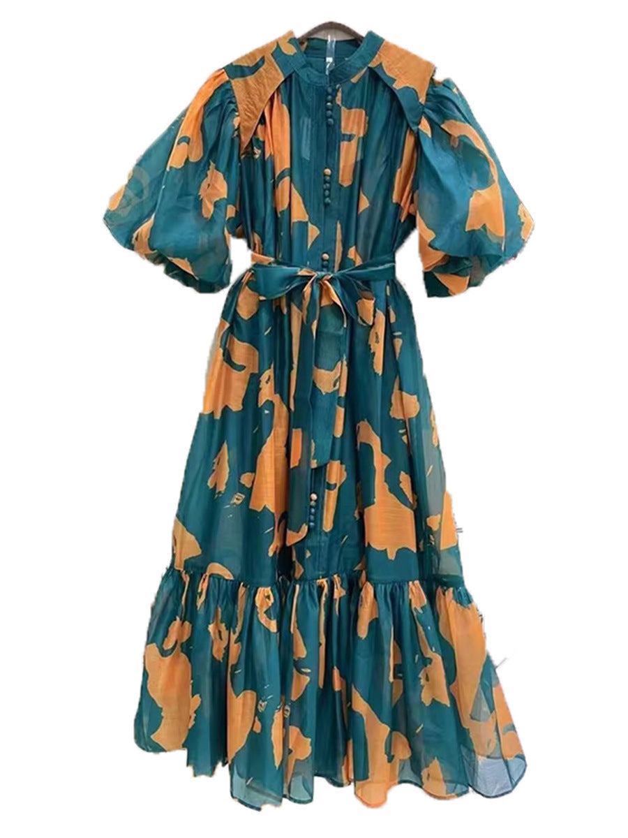 And Leisure Holiday Dress 2025 Summer New Loose Print Bubble Sleeve Tie Waist Dress