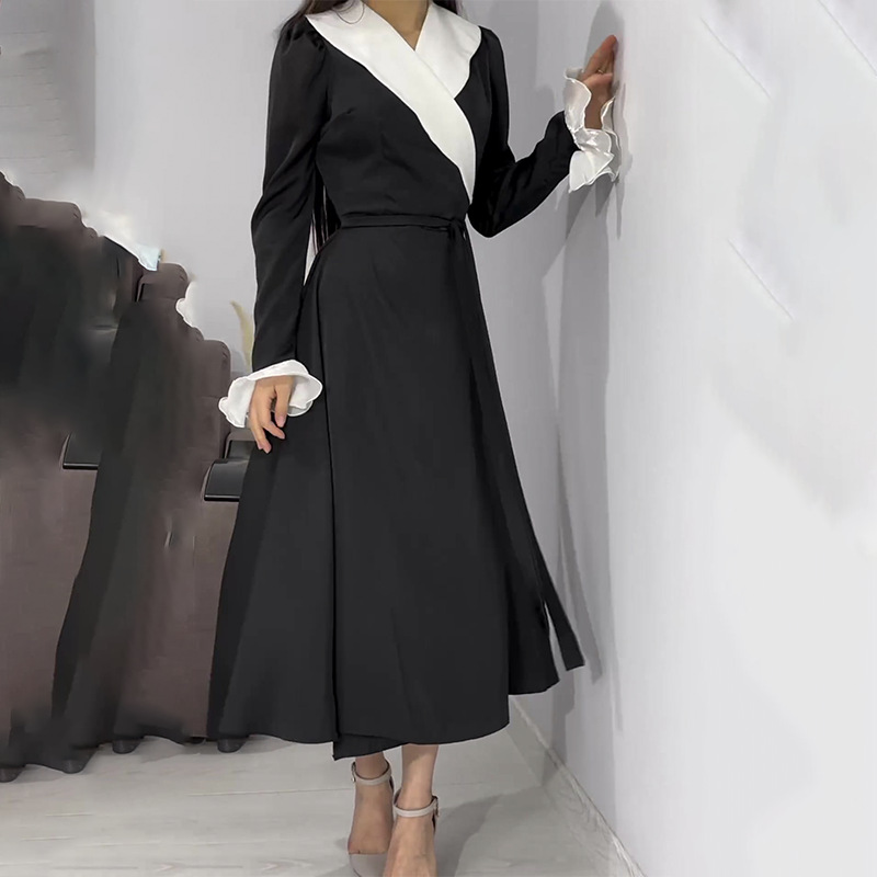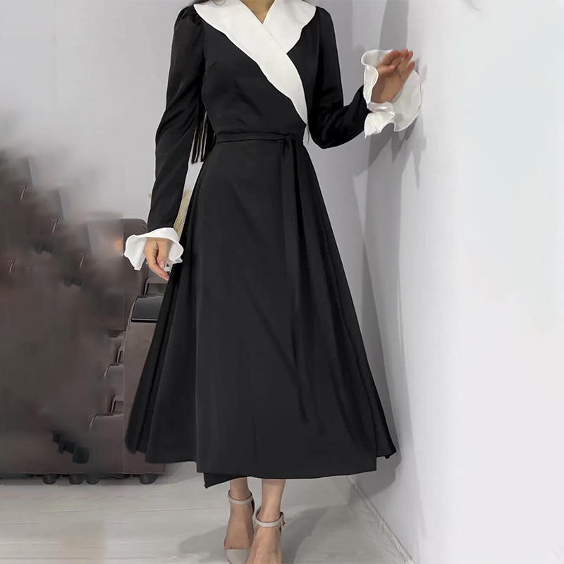 Cross Lotus Collar Temperament Black And White Bumpy Leaf Sleeve Umbrella Dress Dress Dress Dress
