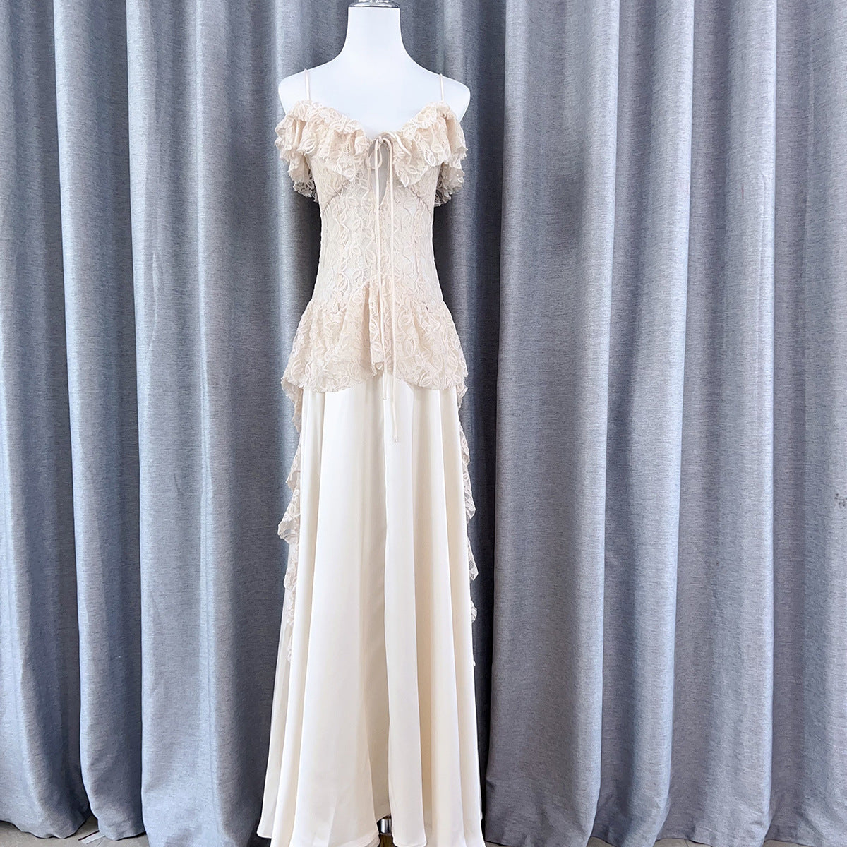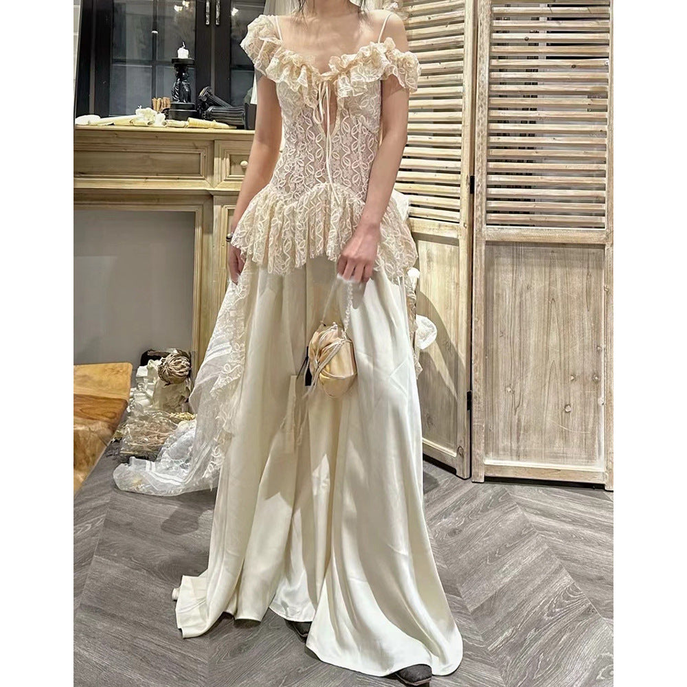 Design Lace Stitching Dress Retro Temperament Shoulder Light Luxury Dress 2024 New Model
