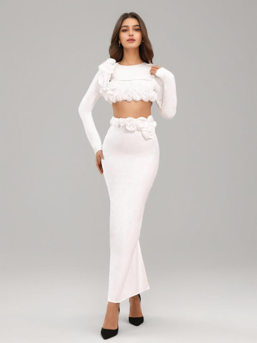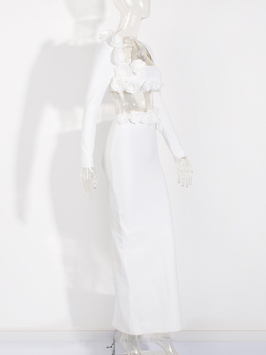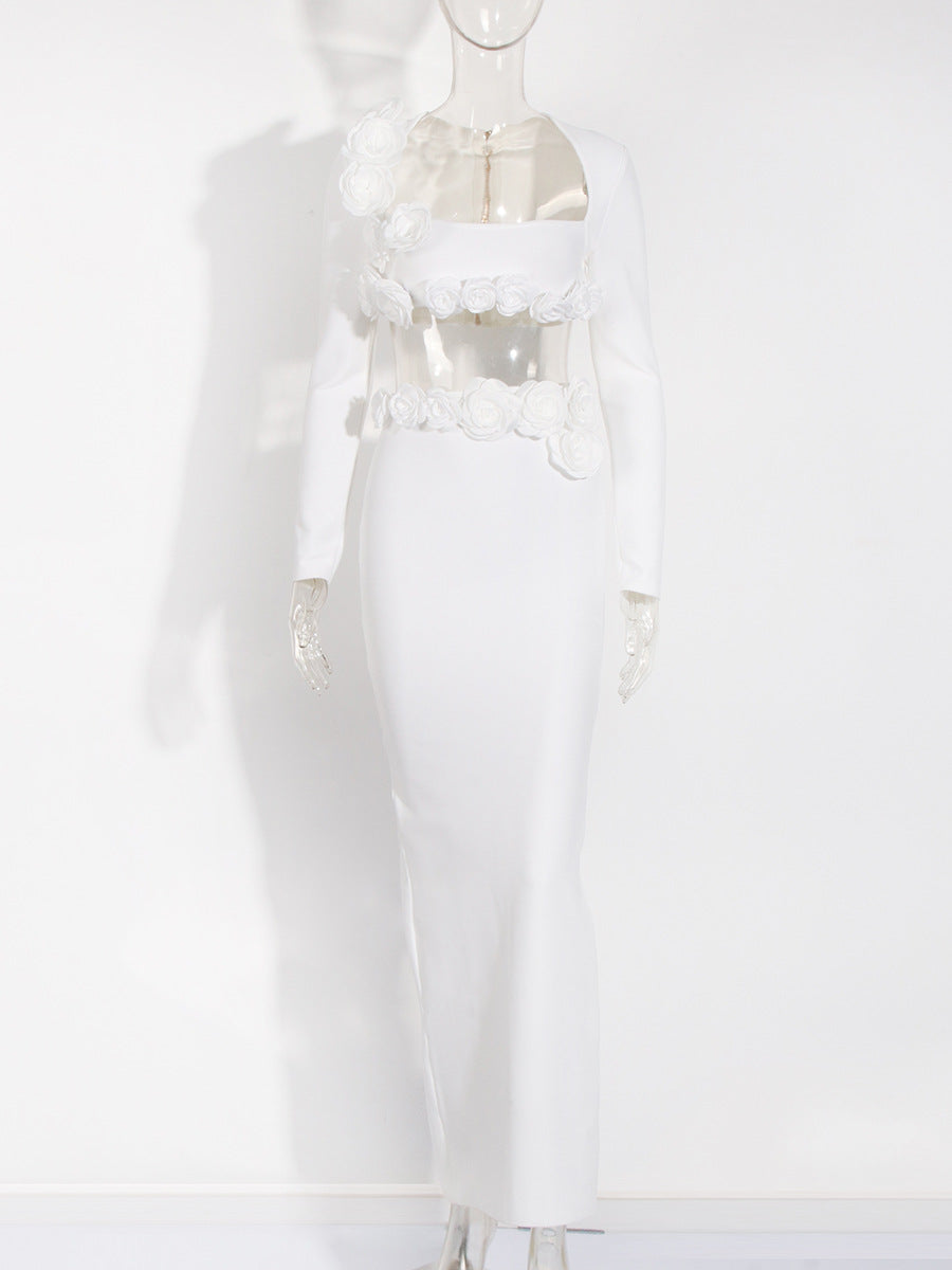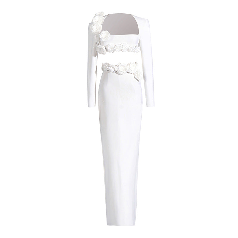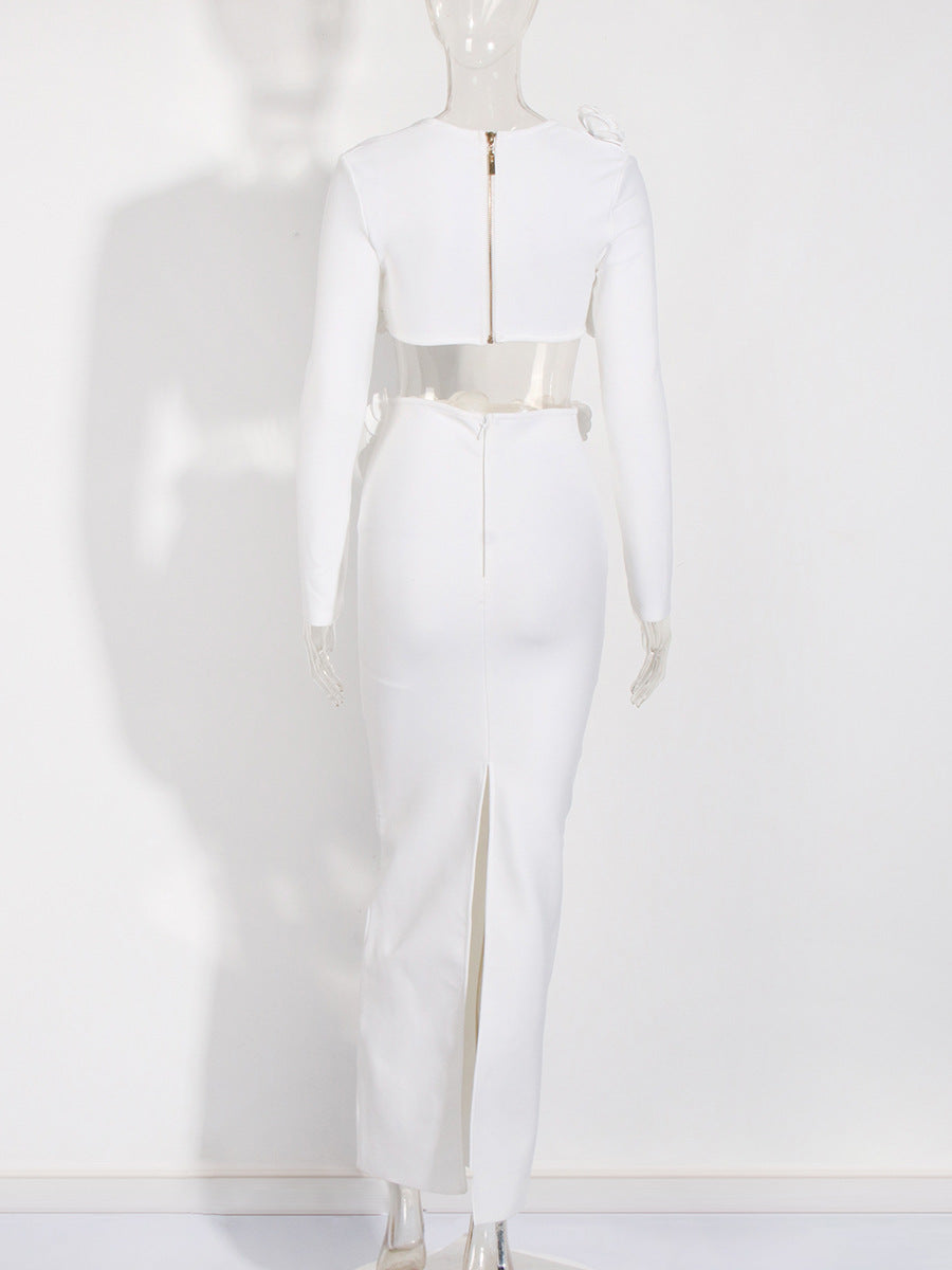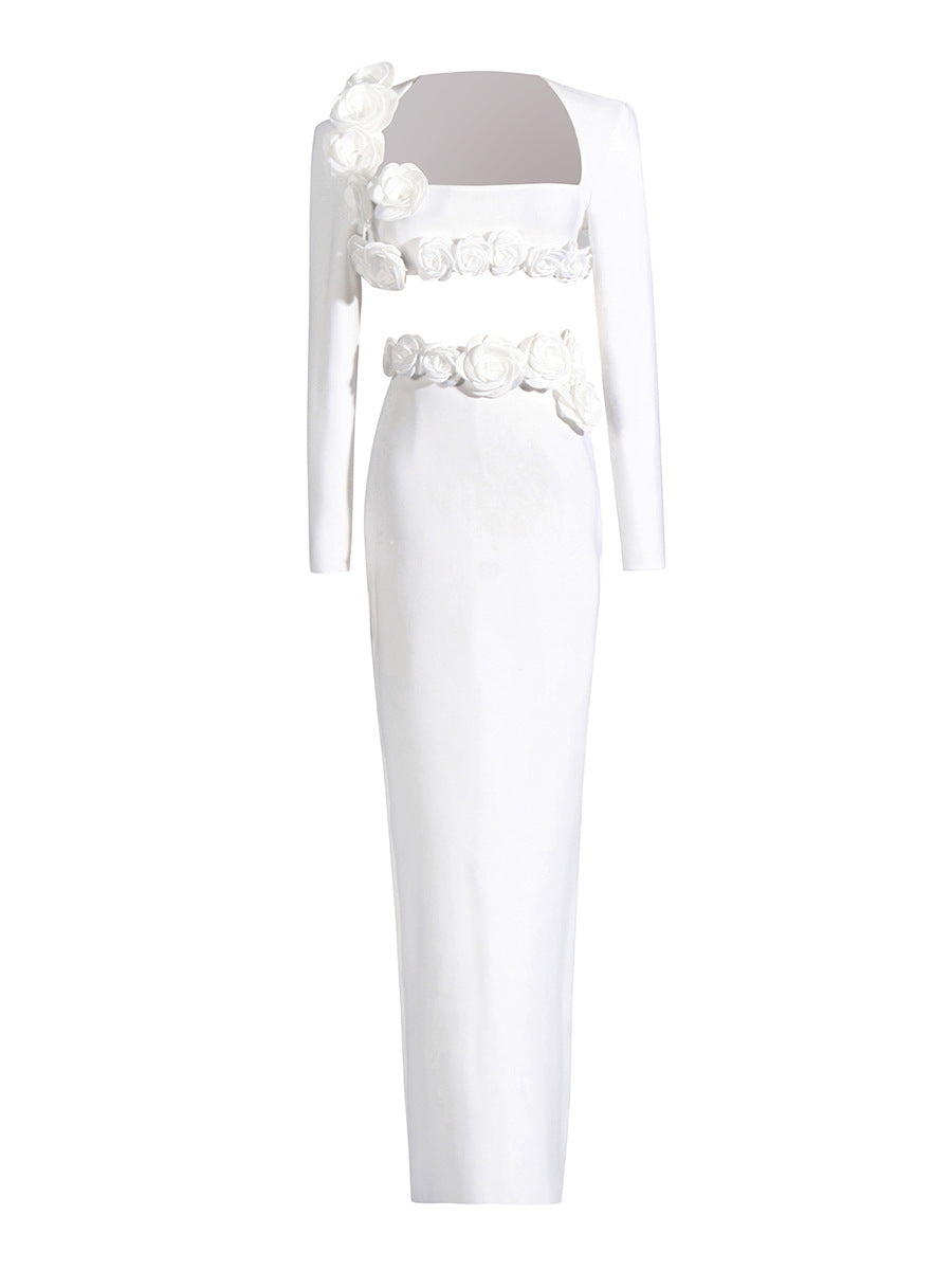 Dress Set Long-Sleeved Flower Top Open Fork Long Dress Sexy Elegant Independent Design Women's Clothing