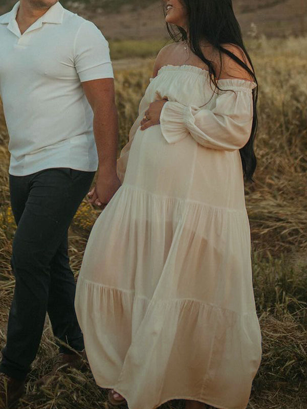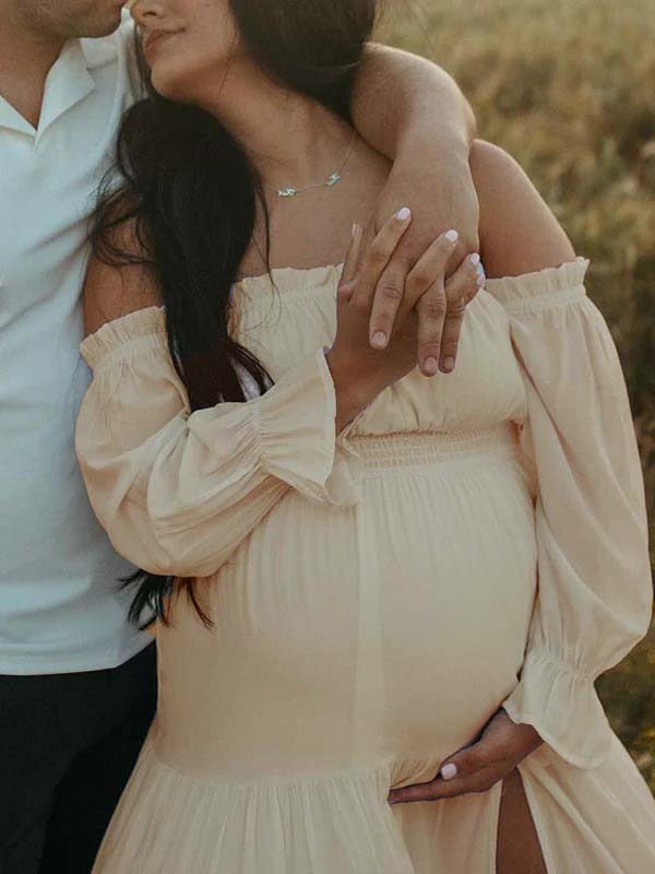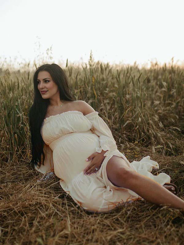 Flowy Off Shoulder Ruffle Falbala Side Slit Big Swing Lantern Sleeve Elegant Holiday Vacation Boho Maternity Photoshoot Baby Shower Maxi Dress Maternity