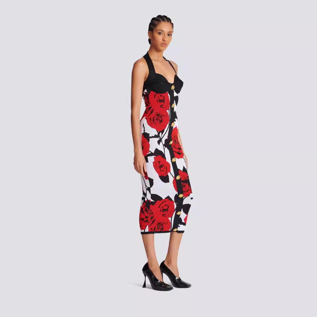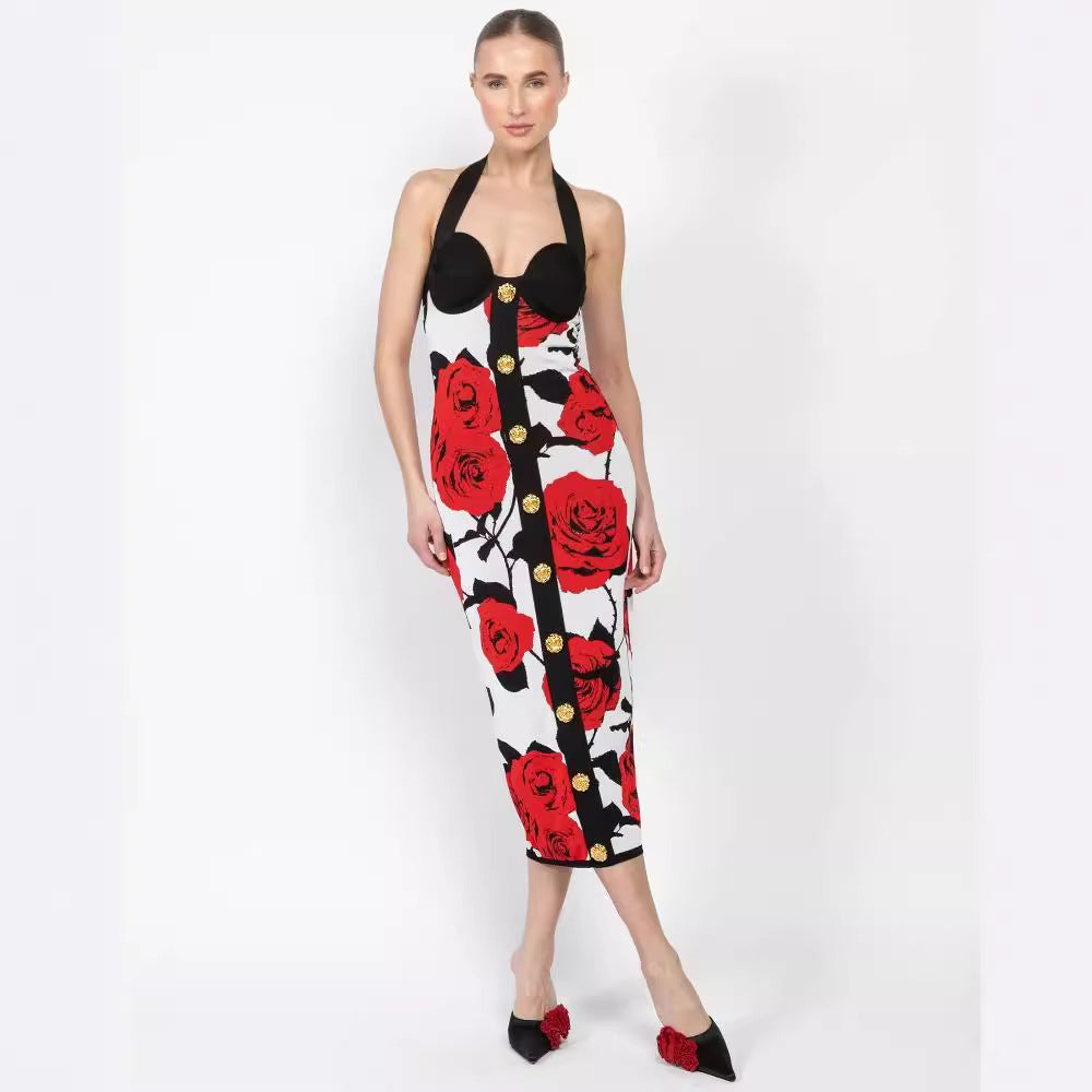 New Small Fragrant Rose Jabreeze Knitted Banda Skirt Sexy Hanging Neck Gold Buckle Elastic Dress