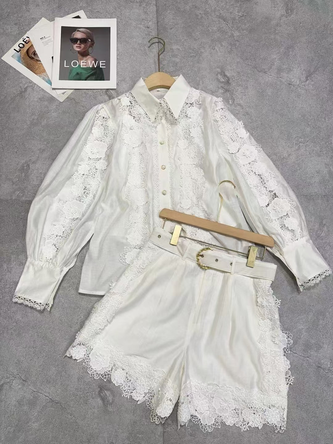New Temperament Hollow Embroidered Lantern Sleeve Tops Shorts With Belt Belt Waist
