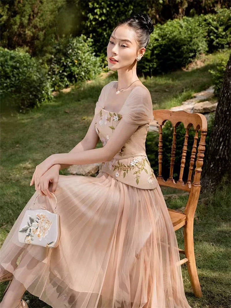 New Vietnamese Niche Brand Embroidery Three-Dimensional Custom Flower Elegant Temperament Mesh Dress