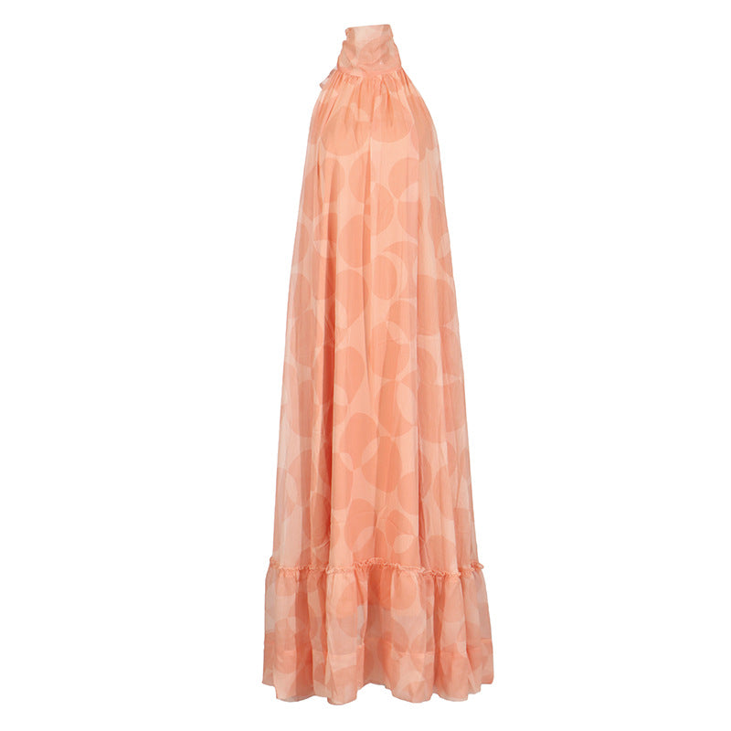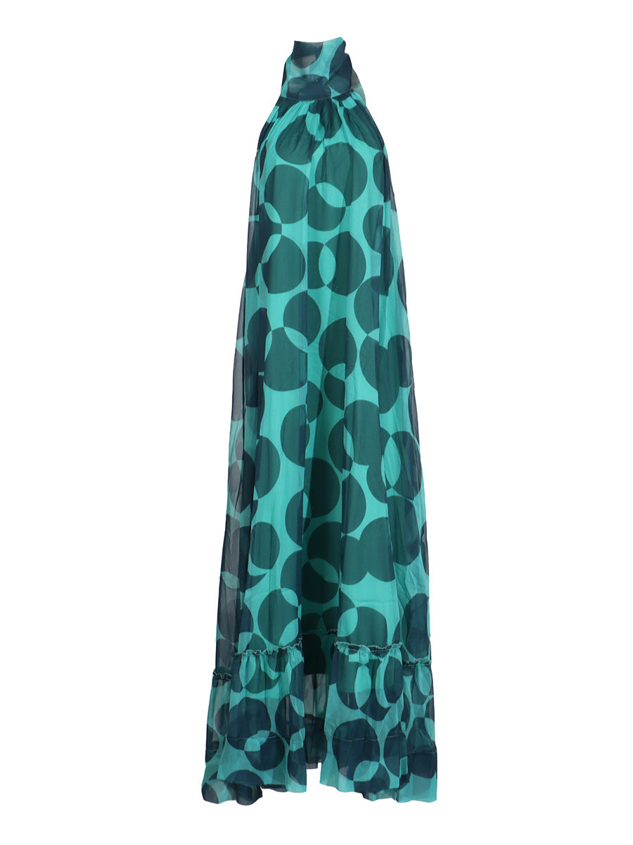 Printed Holiday Dress 2025 Summer Show Back New Hanging Neck Sleeveless Swing Leaves Side Dress Woman