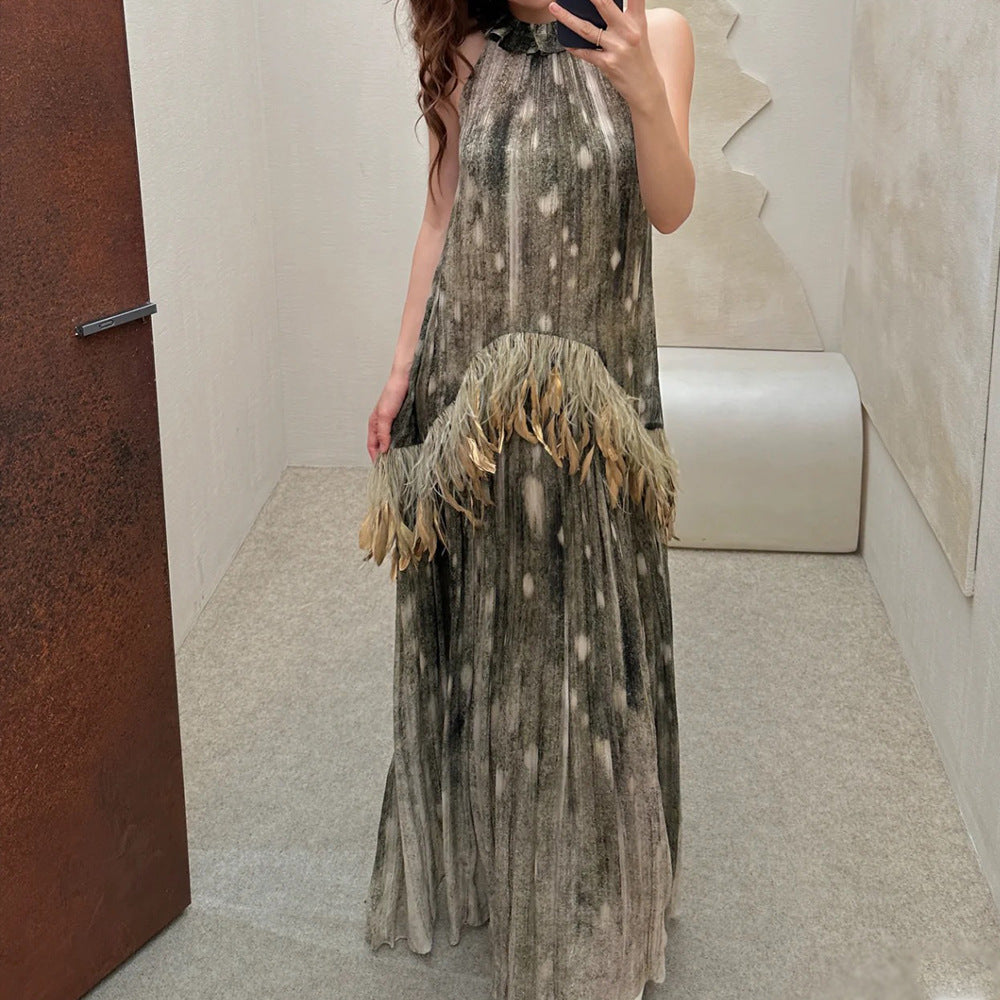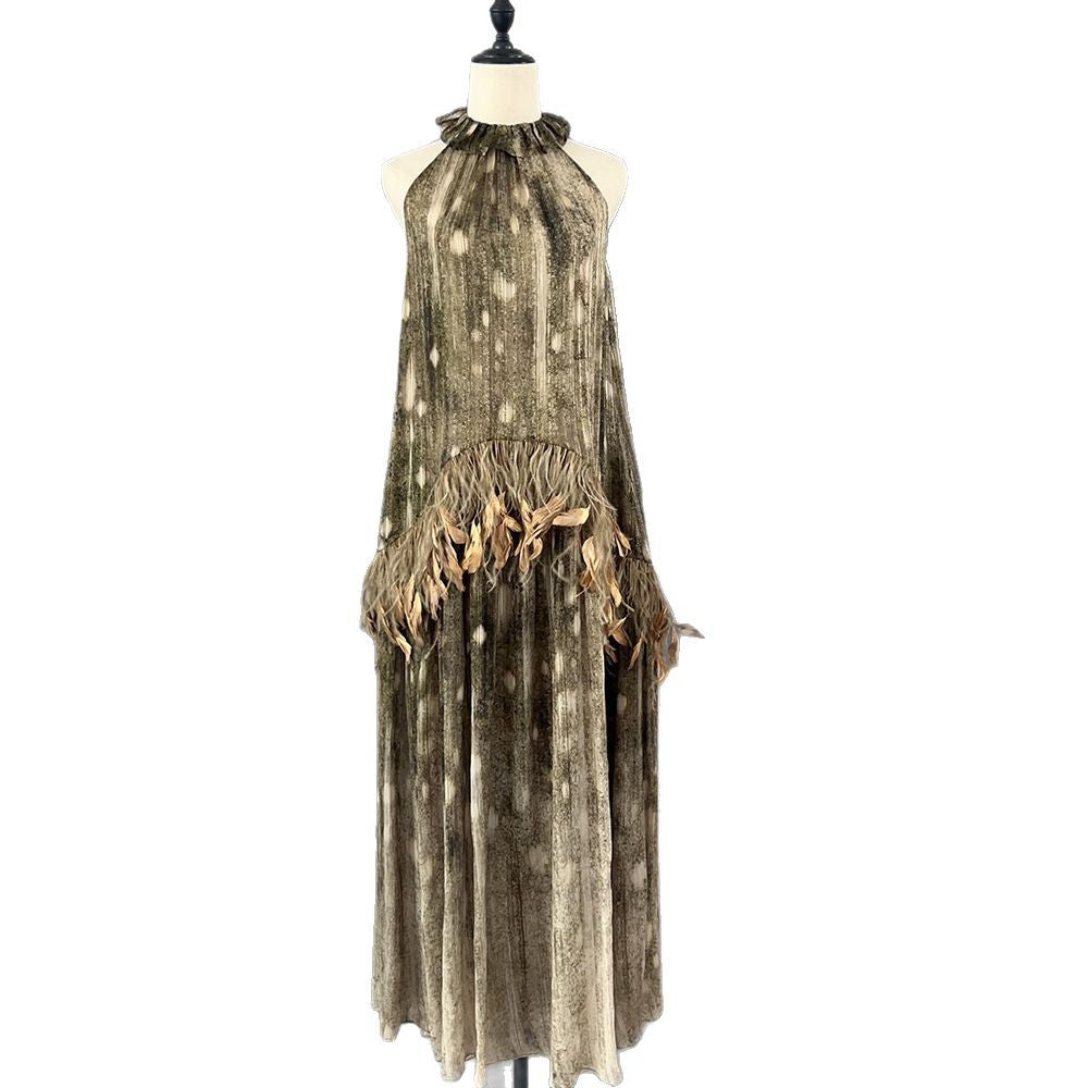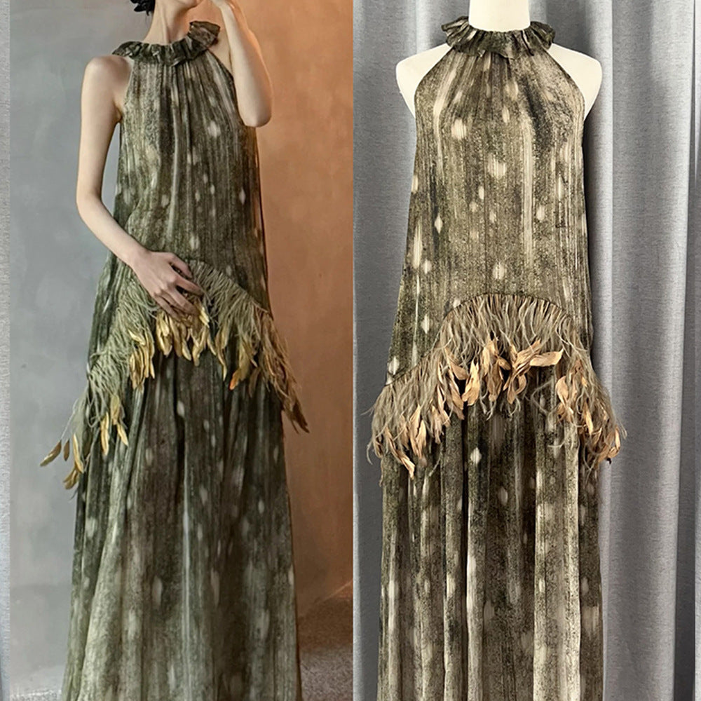 Production Of 25 Spring And Summer Seven-Summer Feathers Decorated Hanging Neck Strapped Sleeveless Dress