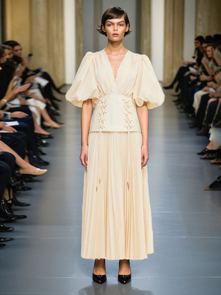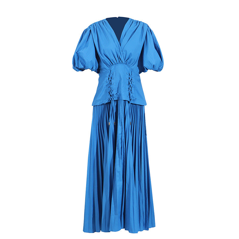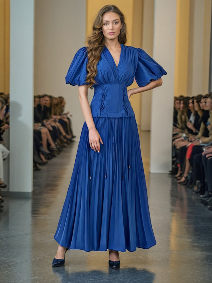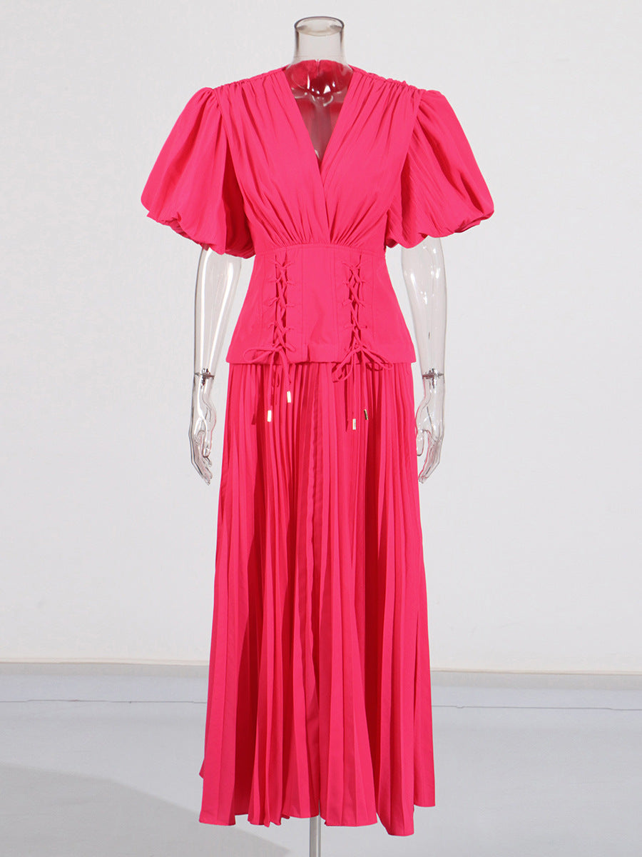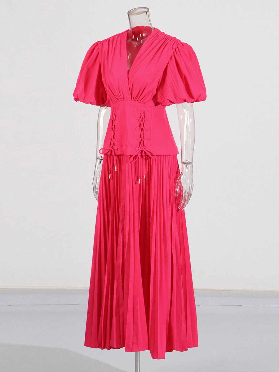 Retro Bubble Sleeve Rope Waist-Waisted Dress 2025 Summer New Folding Splicing Solid Color Dress Dress Women's Dress