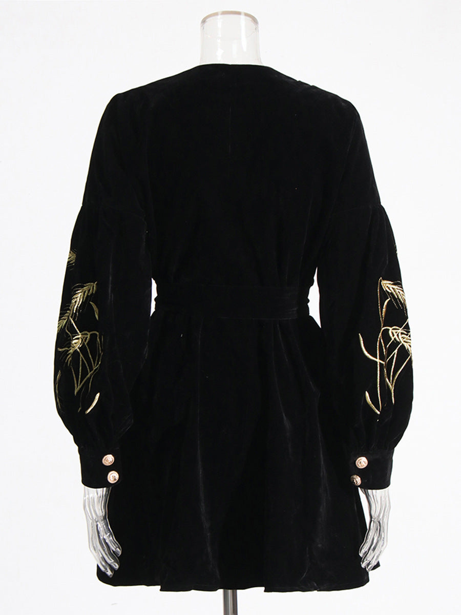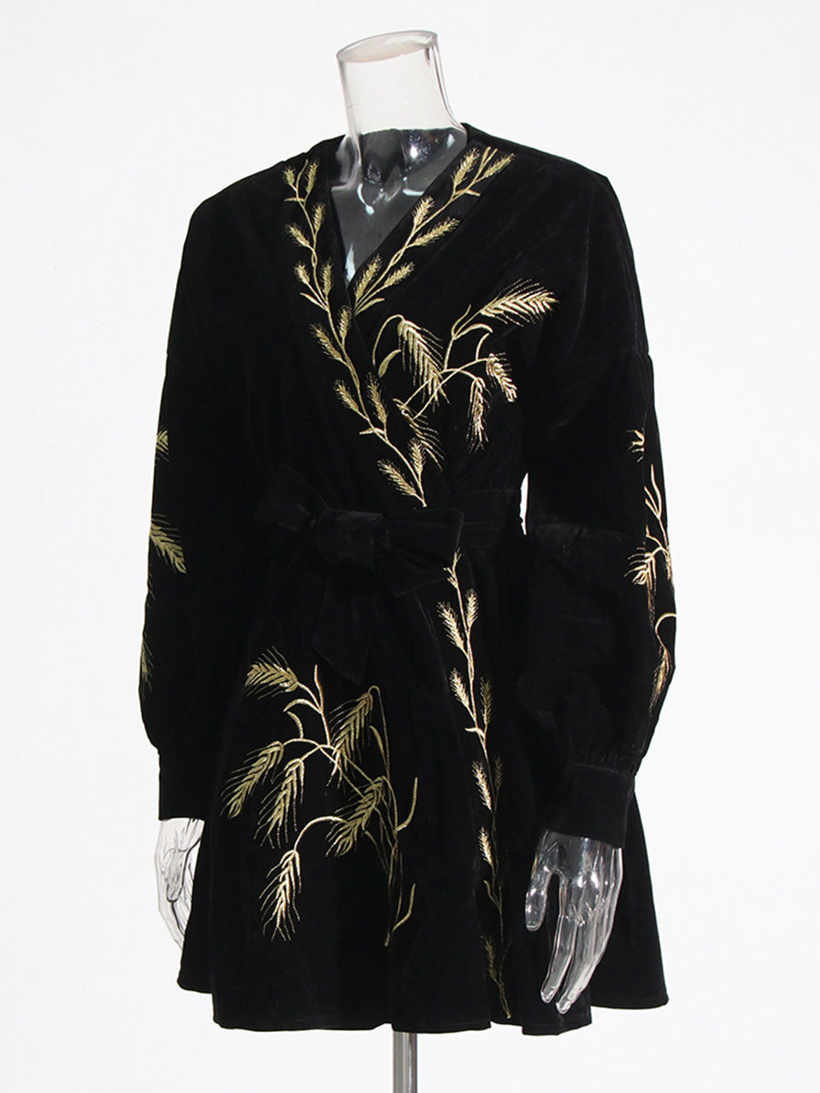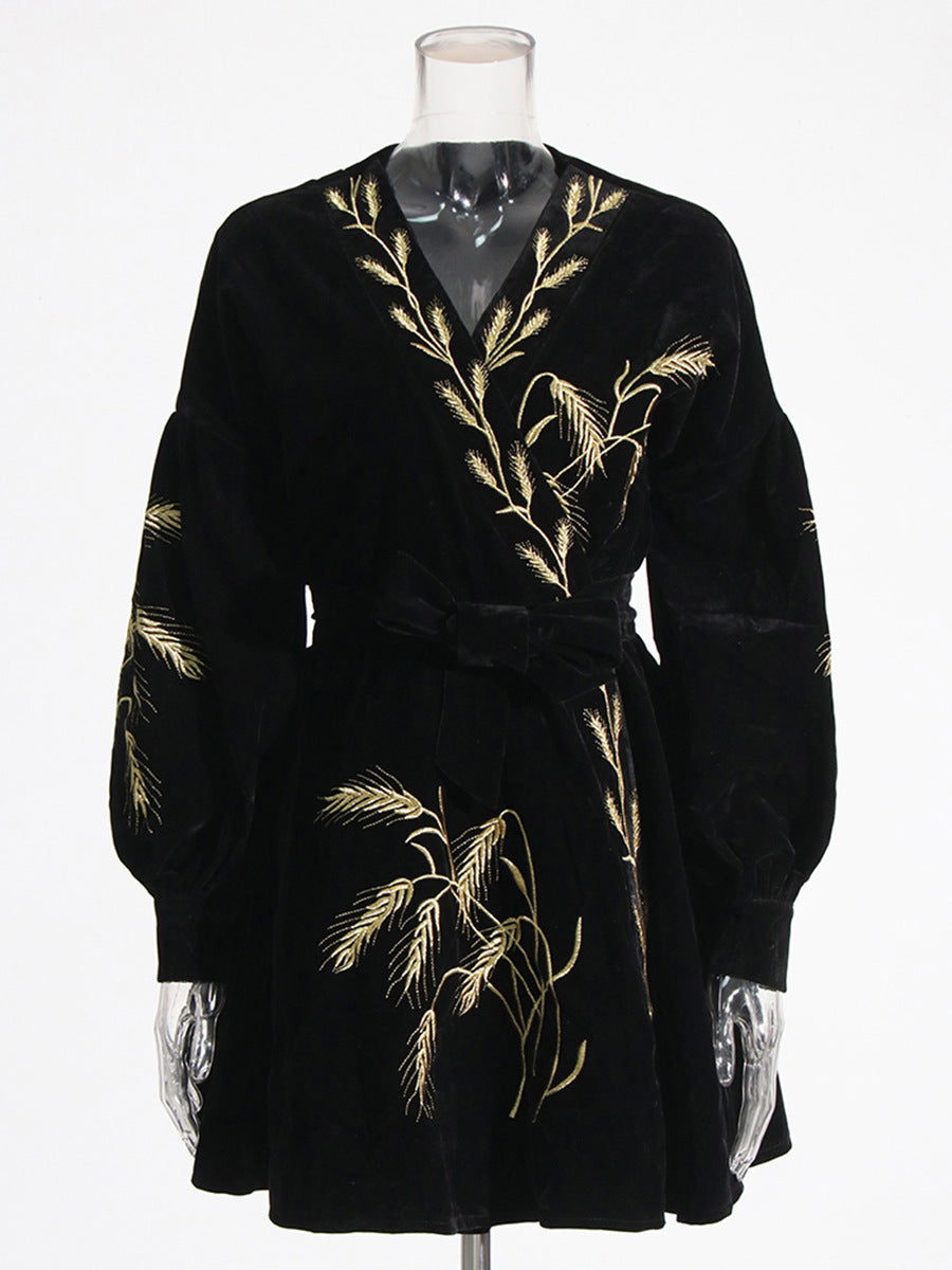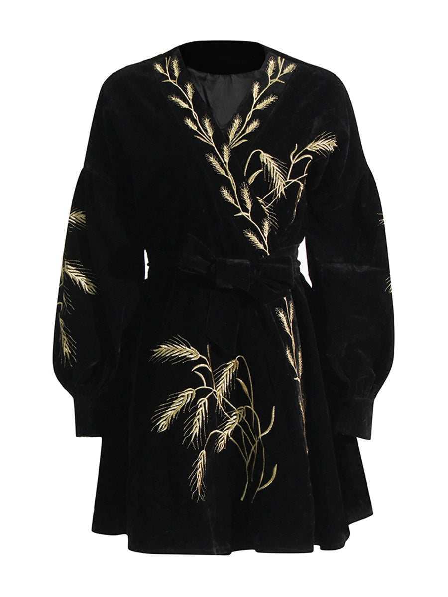 Retro Style Dress Women's Dress 2025 Summer New Heavy Industry Embroidered Wheat Spike Design Velvet Long Sleeve Skirt