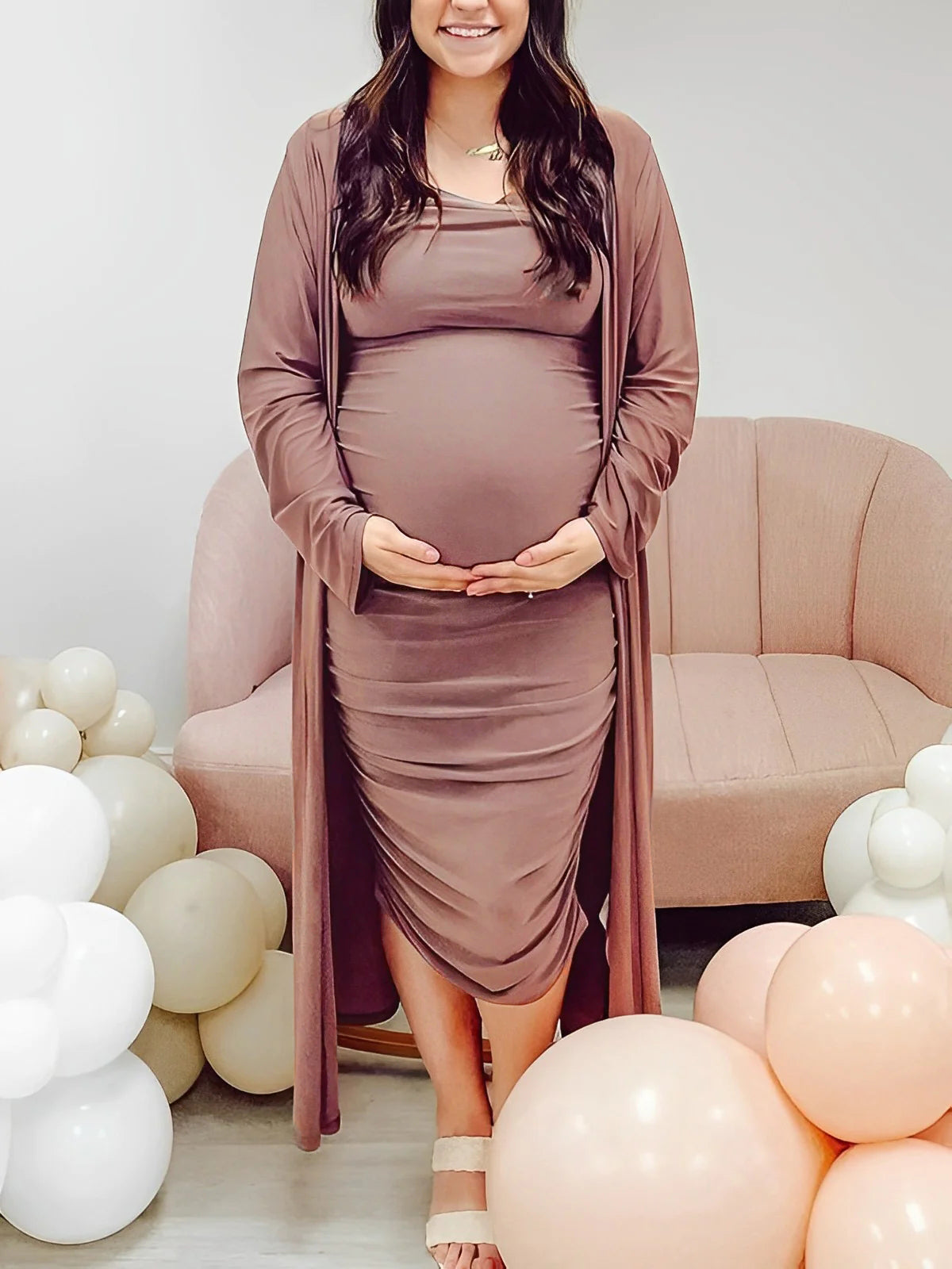 Ruched Cowl Neck Two Piece Spaghetti Strap Long Dress And Duster Coat Long Sleeve Babyshower Maternity Maxi Dress Maternity