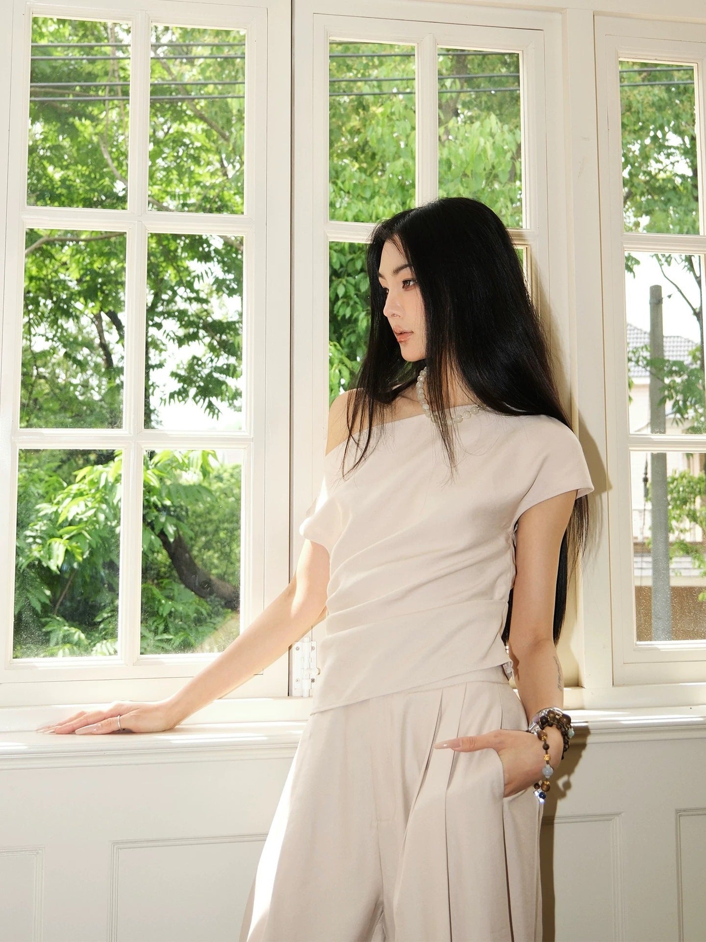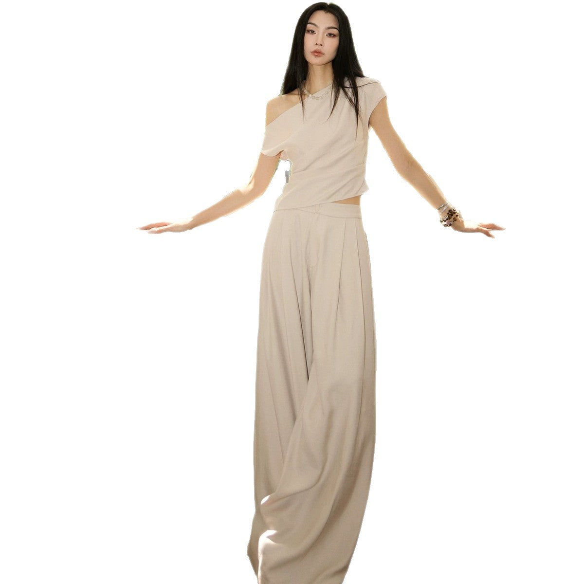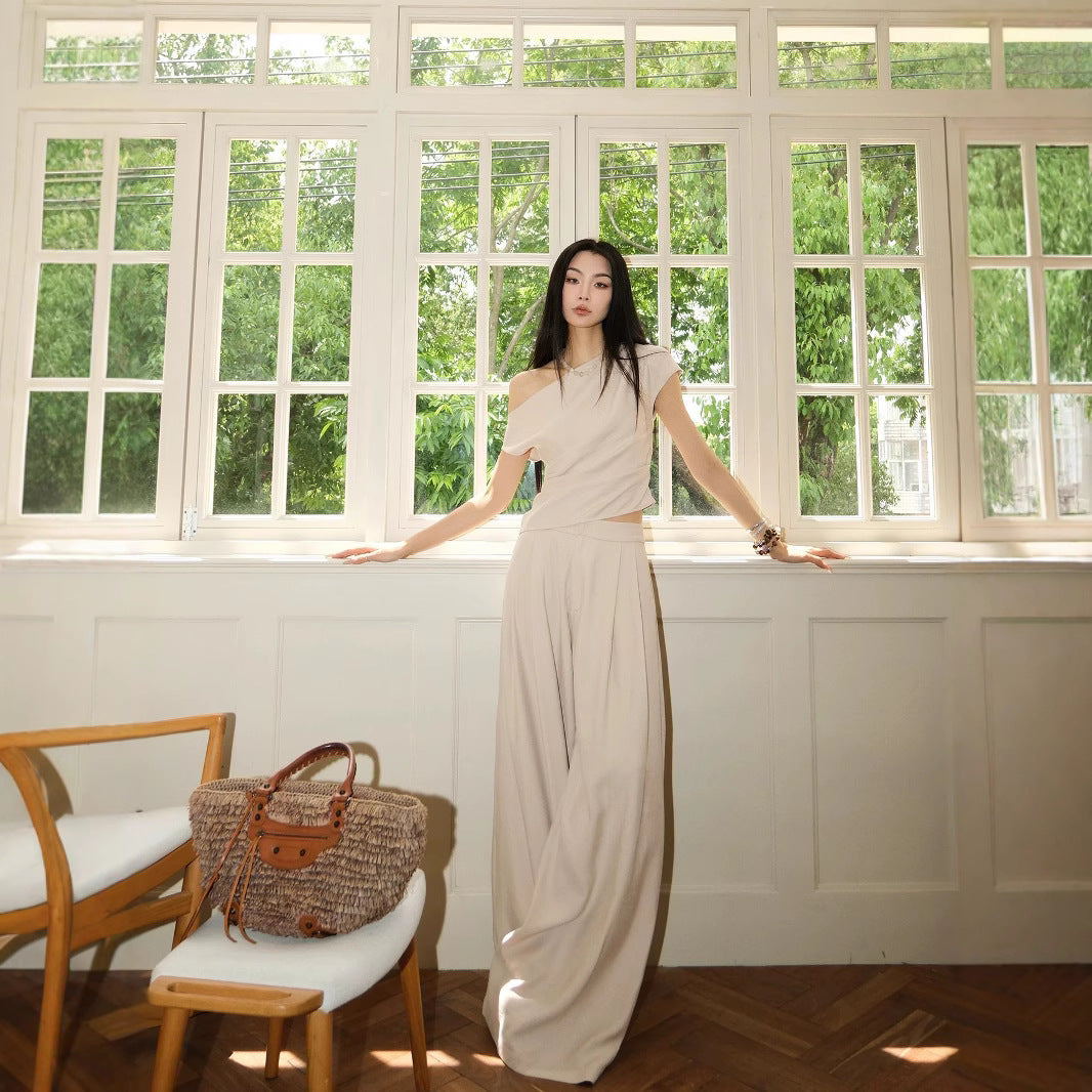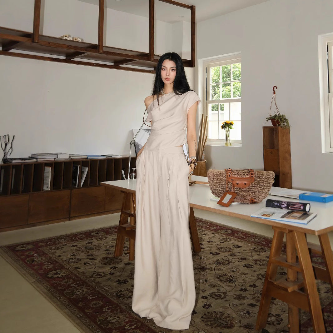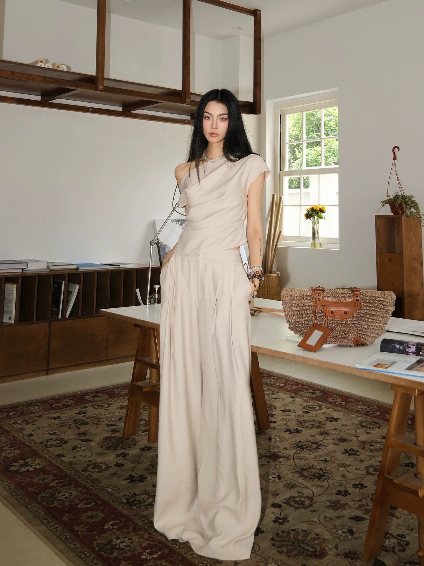 Sanguan 25 New Apricot-Color Collar Top + Wide-Legged Tug Trousers Casual Set
