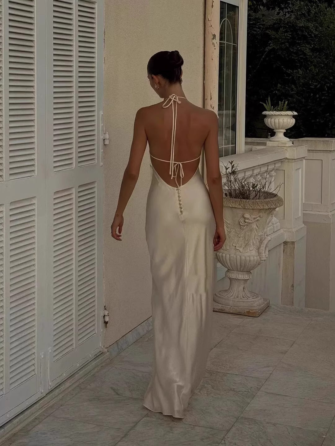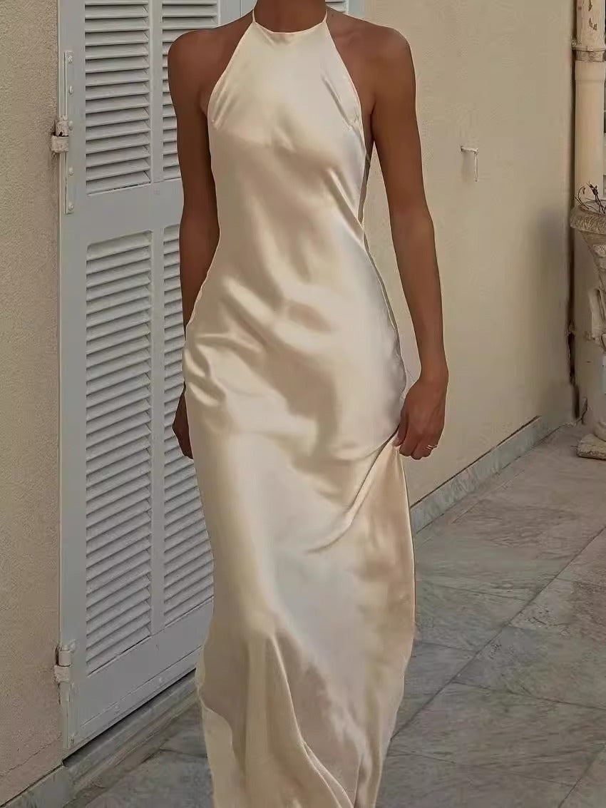 Sexy Bare Back Hanging Neck Sling Dress Simple Imitation Silk Satin Acetic Acid Thin Dress Dress HZ0628