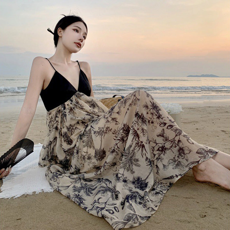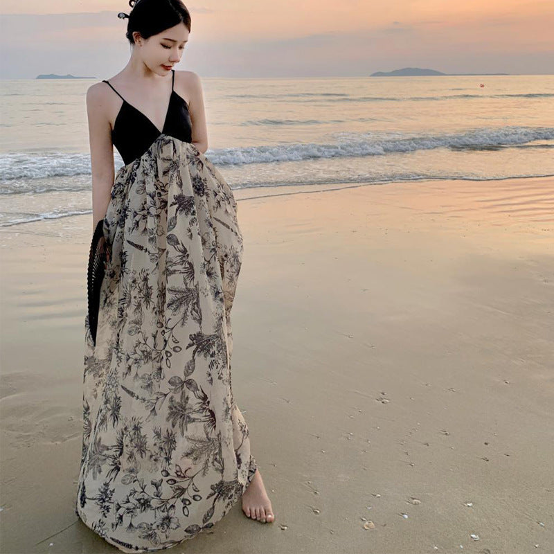 Splicing French Retro Sexy Bareback Dress Sling Dress With Long Skirt Sanya Beach Dress Woman