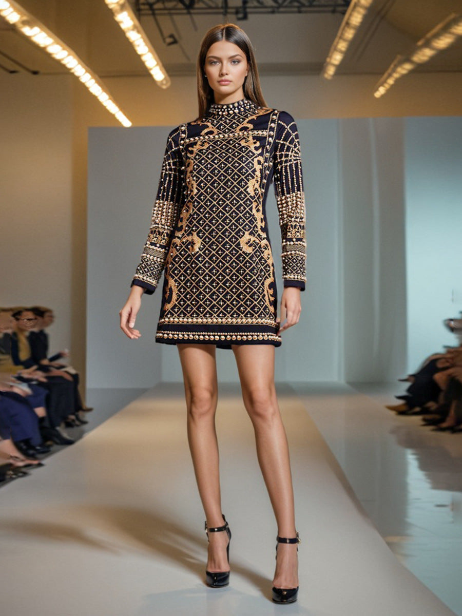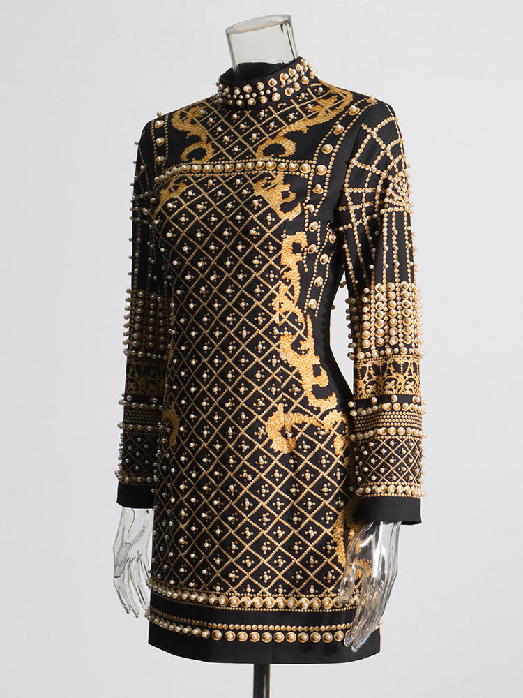 Style Retro Heavy Industry Nail Bead Design Short Dress 2025 Spring New Standing Back Print Dress Woman
