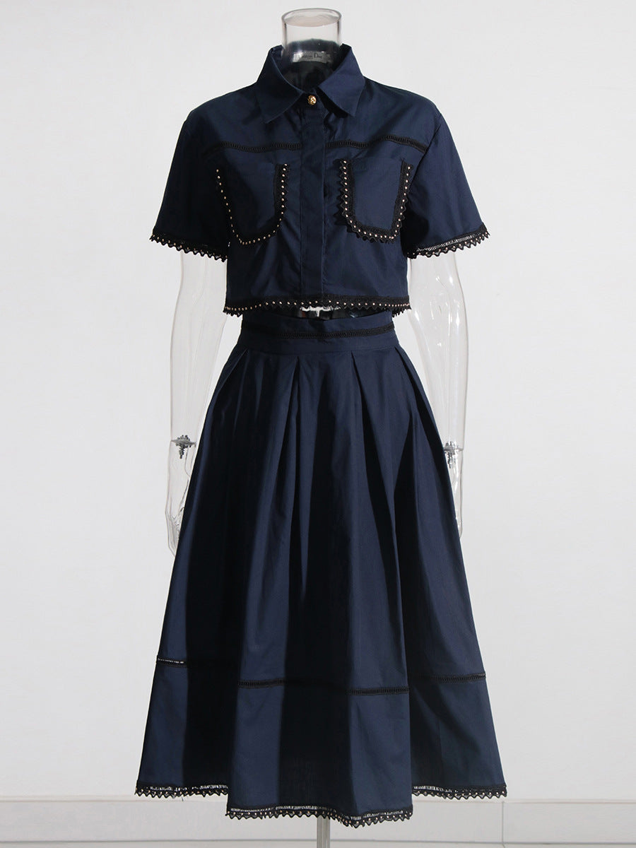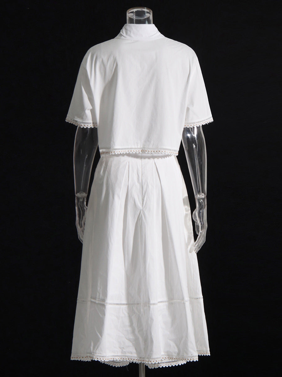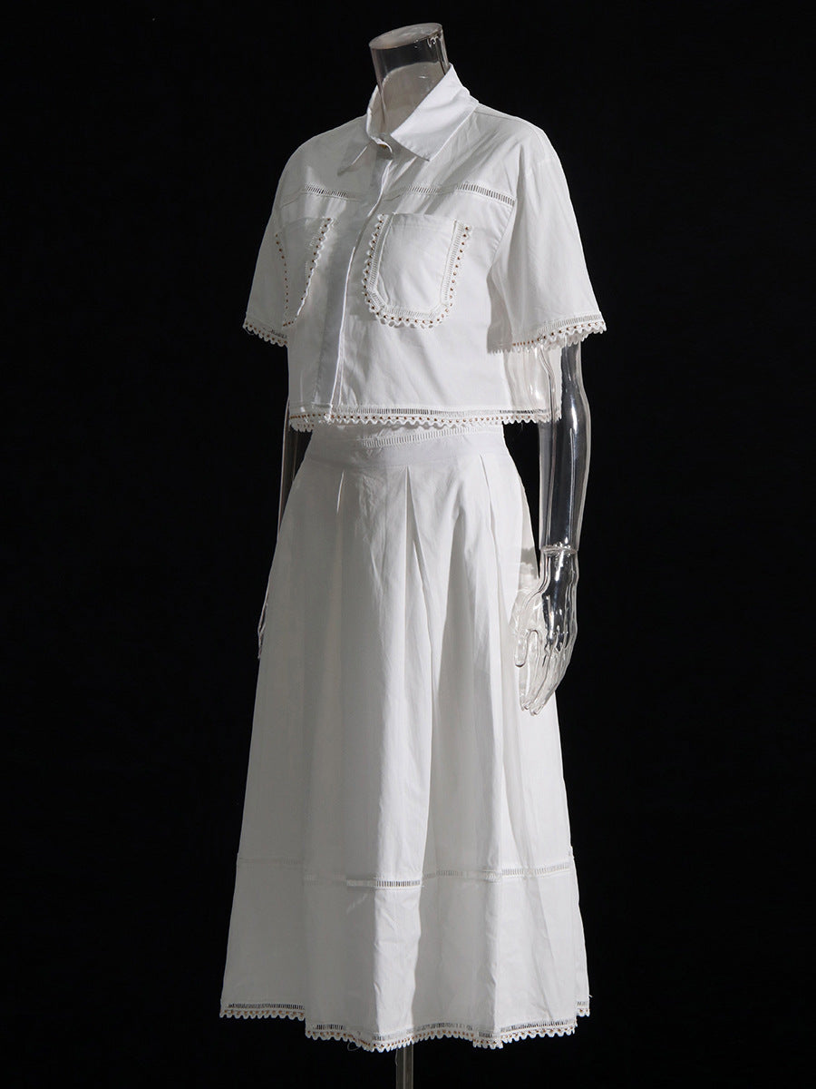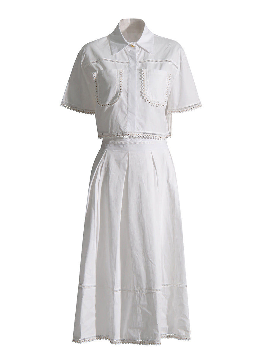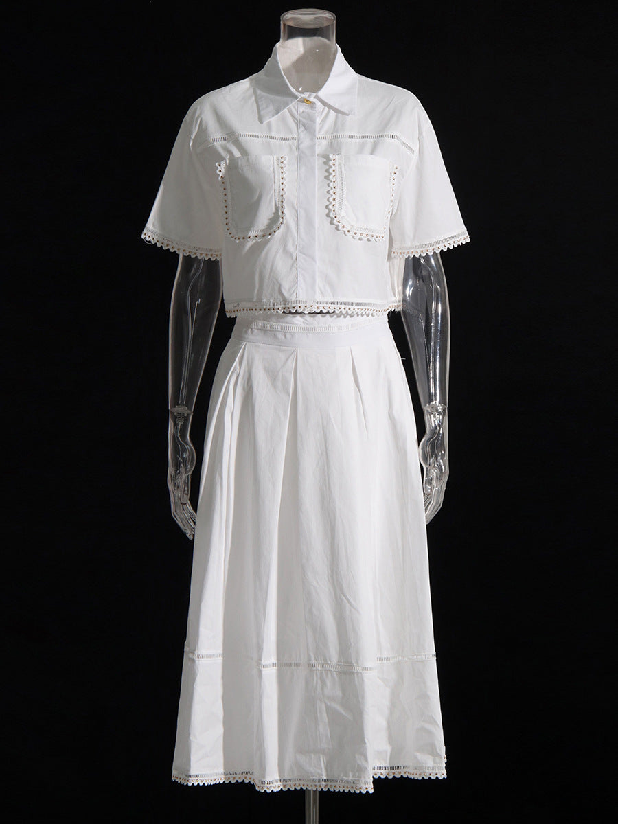 Summer New Collar Short-Sleeved Shirt + High Waist Long Skirt Lace Embroidery Two-Set Suit Woman