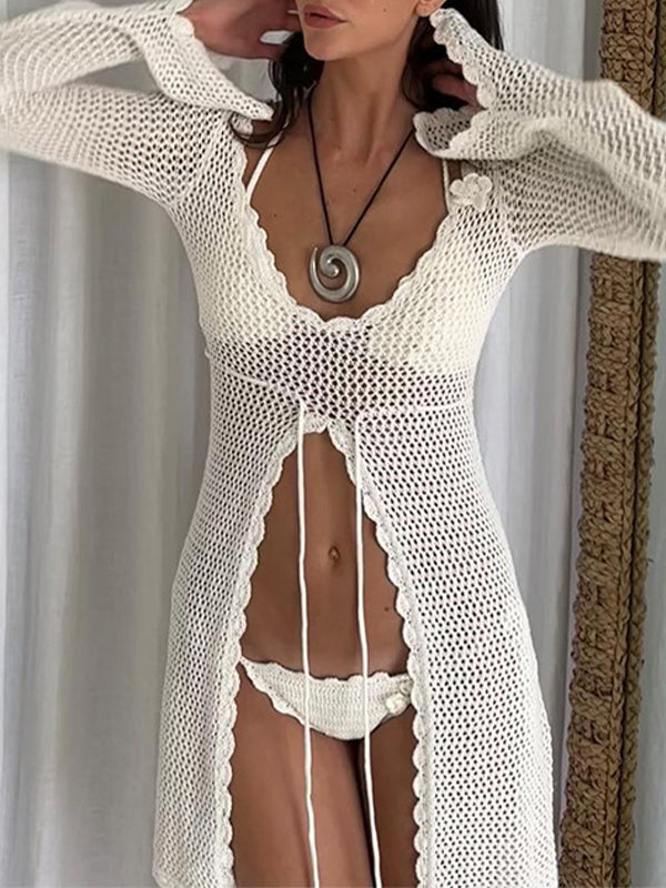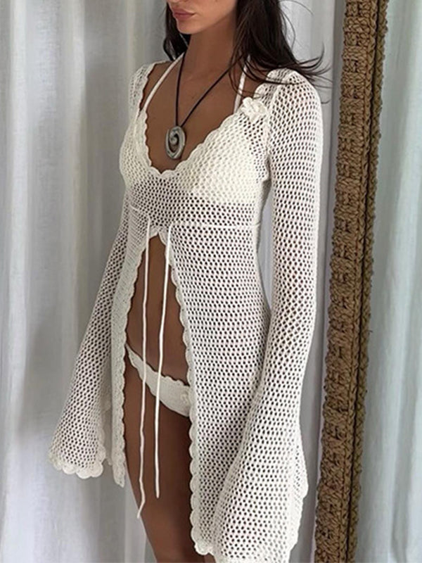 White 2-in-1 3D Flower Tie Ruffle Slit Flare Sleeve Fashion Beach Vacation Cover Up Photoshoot Maternity Mini Dress Maternity