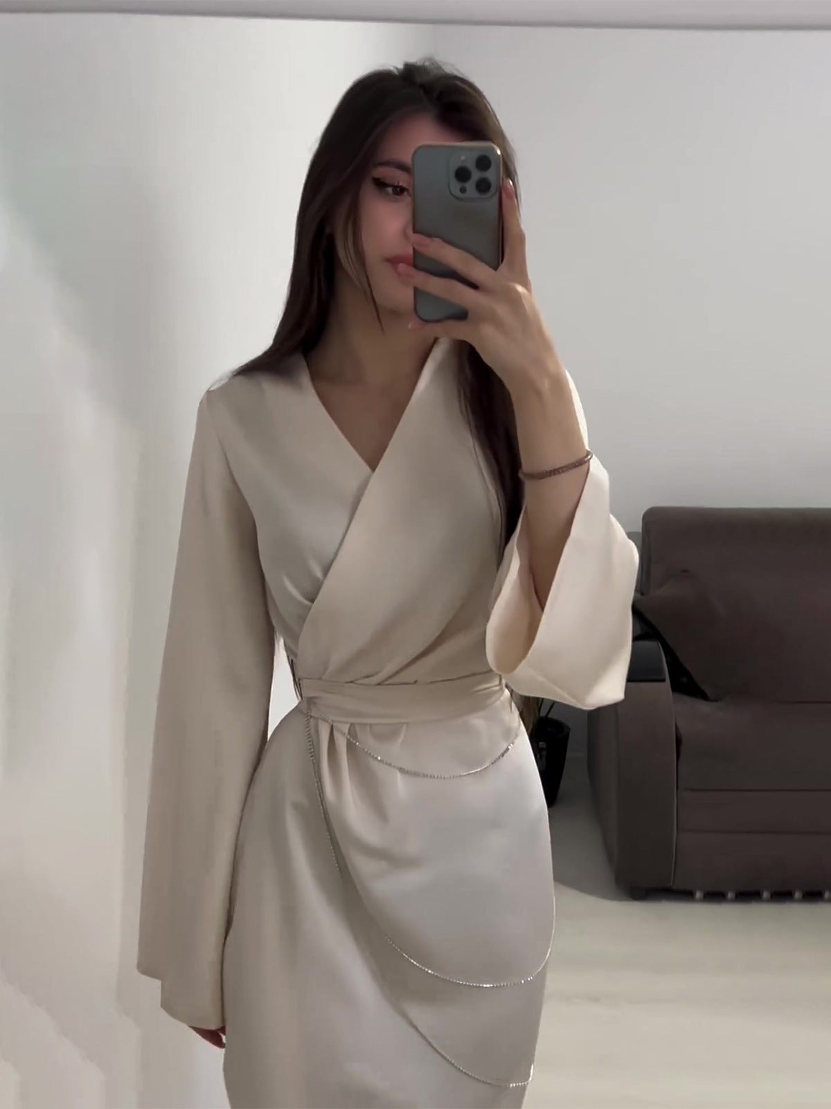 Women's Clothing 2025 Autumn New Long Dress Temperament Loose Metal Decoration V Tie With Dress