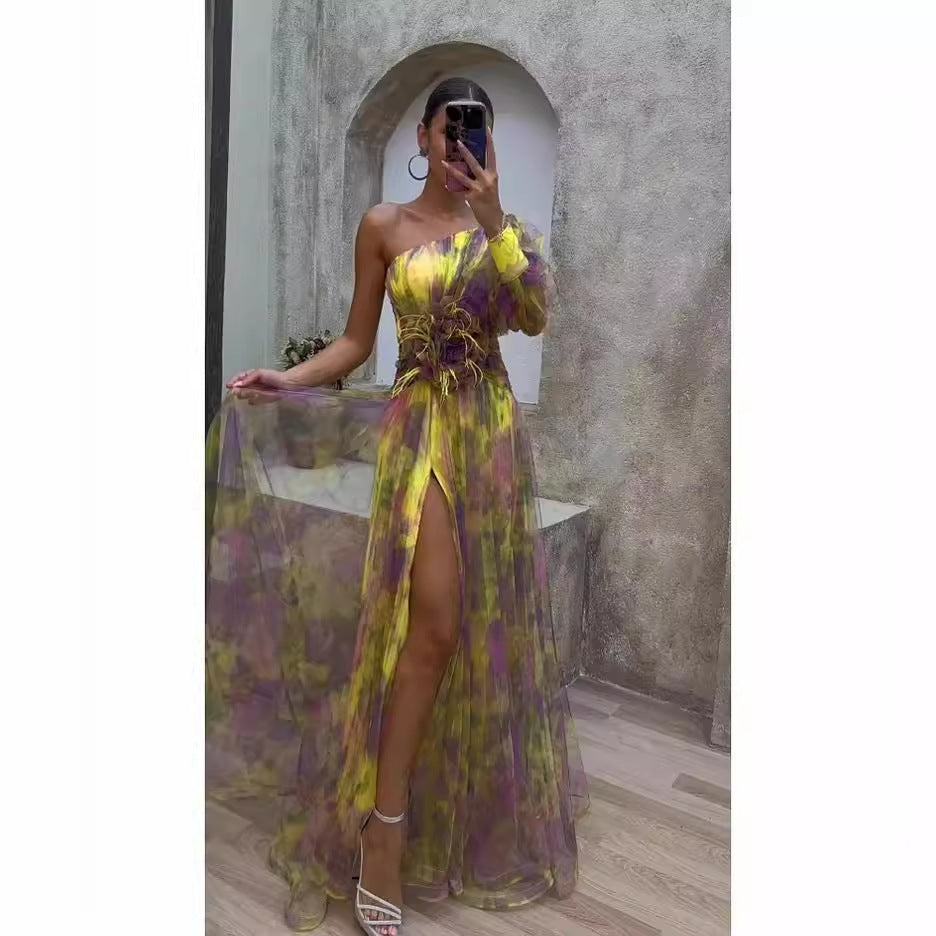 Women's Explosive Flower Slant Shoulders Big Smash Flower High-End Dress HZ0628