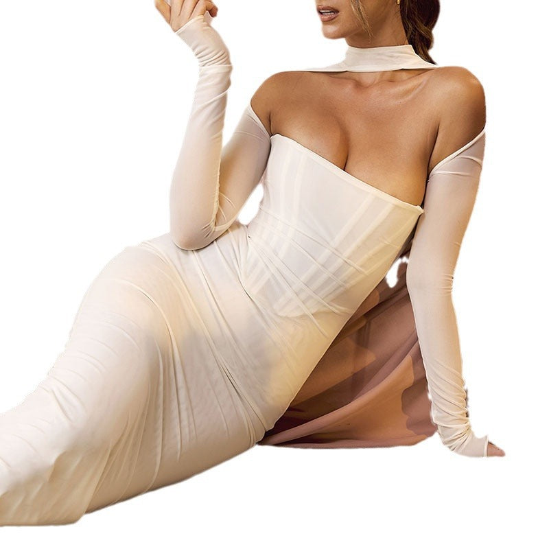 Women's New Solid Color Sexy Hot Girl Hollow Low-Chest Skirt Perspective Yarn Mesh Long-Sleeved Dress DJPT