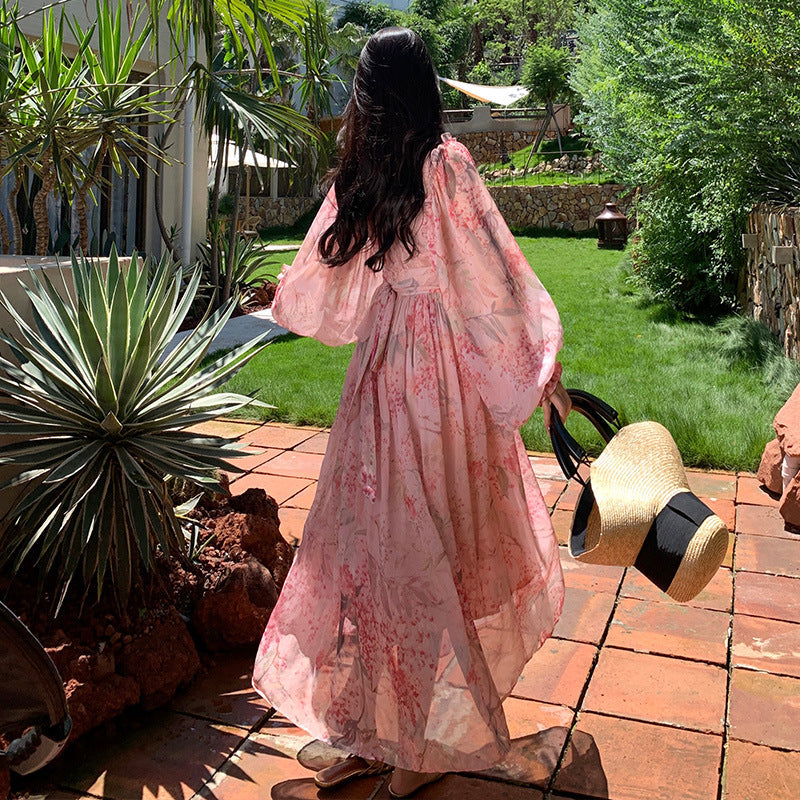 And Autumn 2024 New Pink Long-Sleeved Broken Flower V-Neck Dress To Close The Waist Lantern Sleeve Holiday Beach Skirt