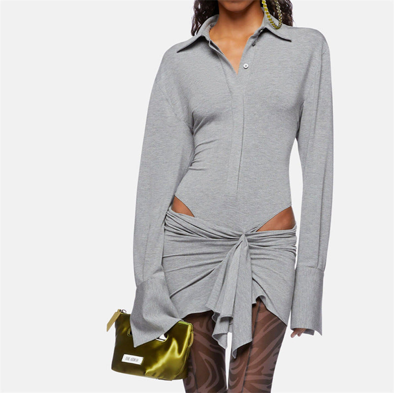 Babes Gray Long-Sleeved Polo Collar Short Dress Girl Niche Fall Sexy Irregular Hollow Dress