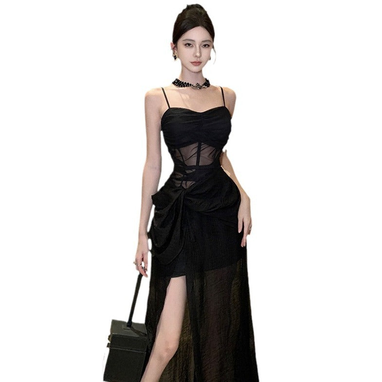 Black Sling Dress Woman Summer Niche High-Sensance Hottie Open Fork Long Skirt