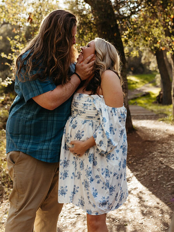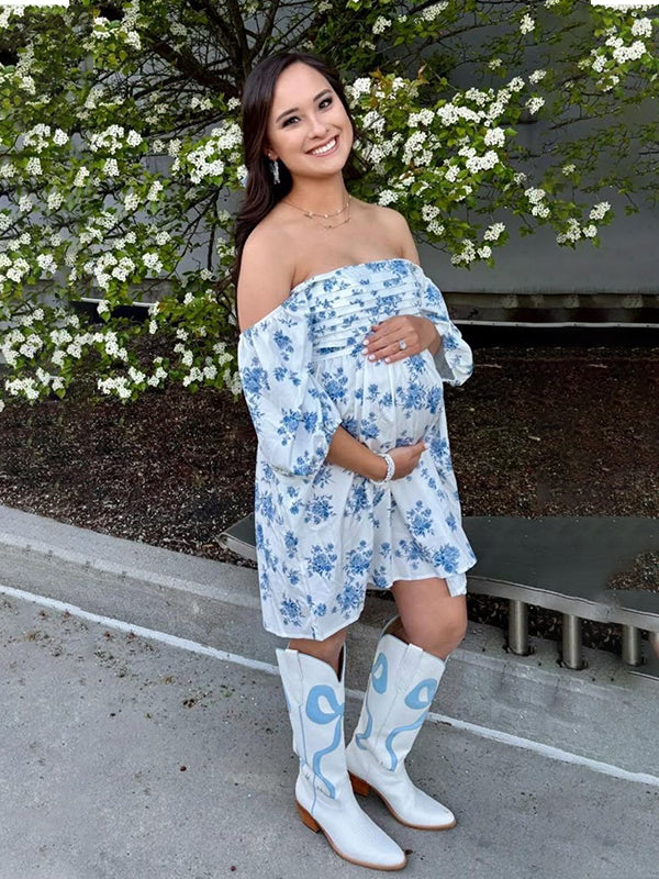 Blue Floral Ruched Off Shoulder A-line Puff Sleeve Sweet Going Out Maternity Photoshoot Baby Shower Mini Dress Maternity
