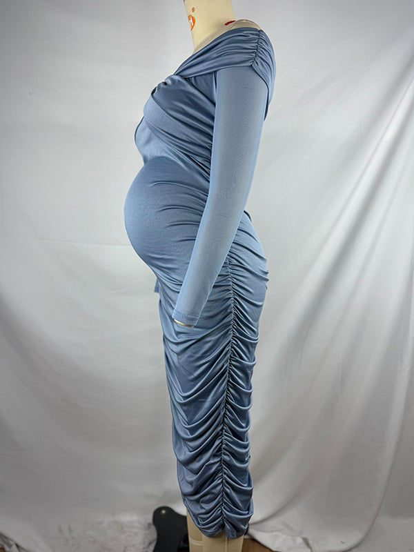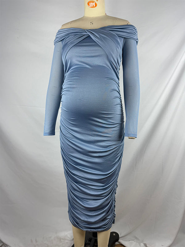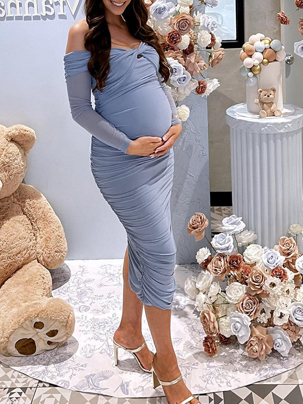 Blue Ruched Off Shoulder Cross Chest Bodycon Elegant Wedding Guest Maternity Photoshoot Midi Dress Maternity