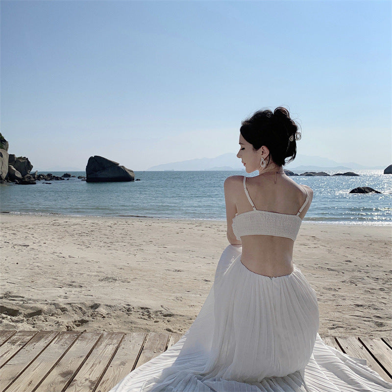 Breast Slings White Languing Folded Long Skirt Banquet Dress Holiday 100 Folded Beach Dress Girl