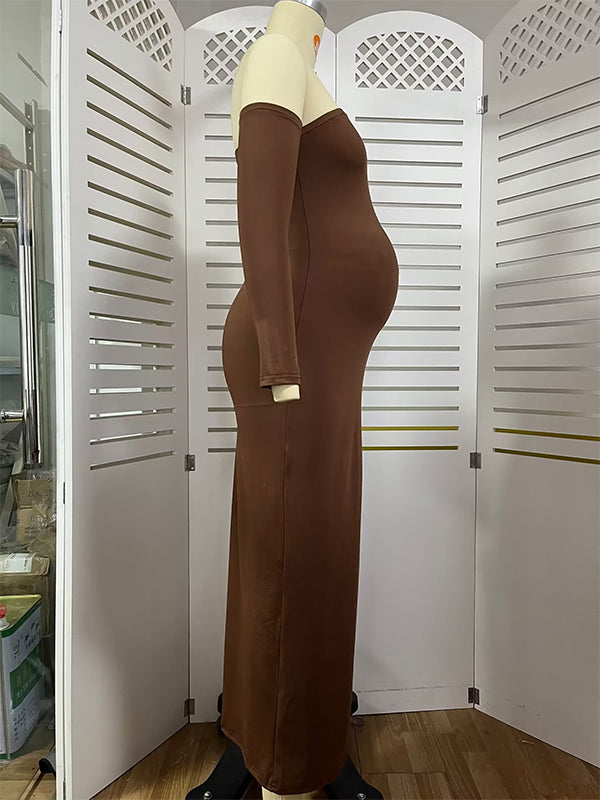 Brown Off Shoulder Long Sleeve Bodycon Elegant Going Out Maternity Photoshoot Baby Shower Party Maxi Dress Maternity