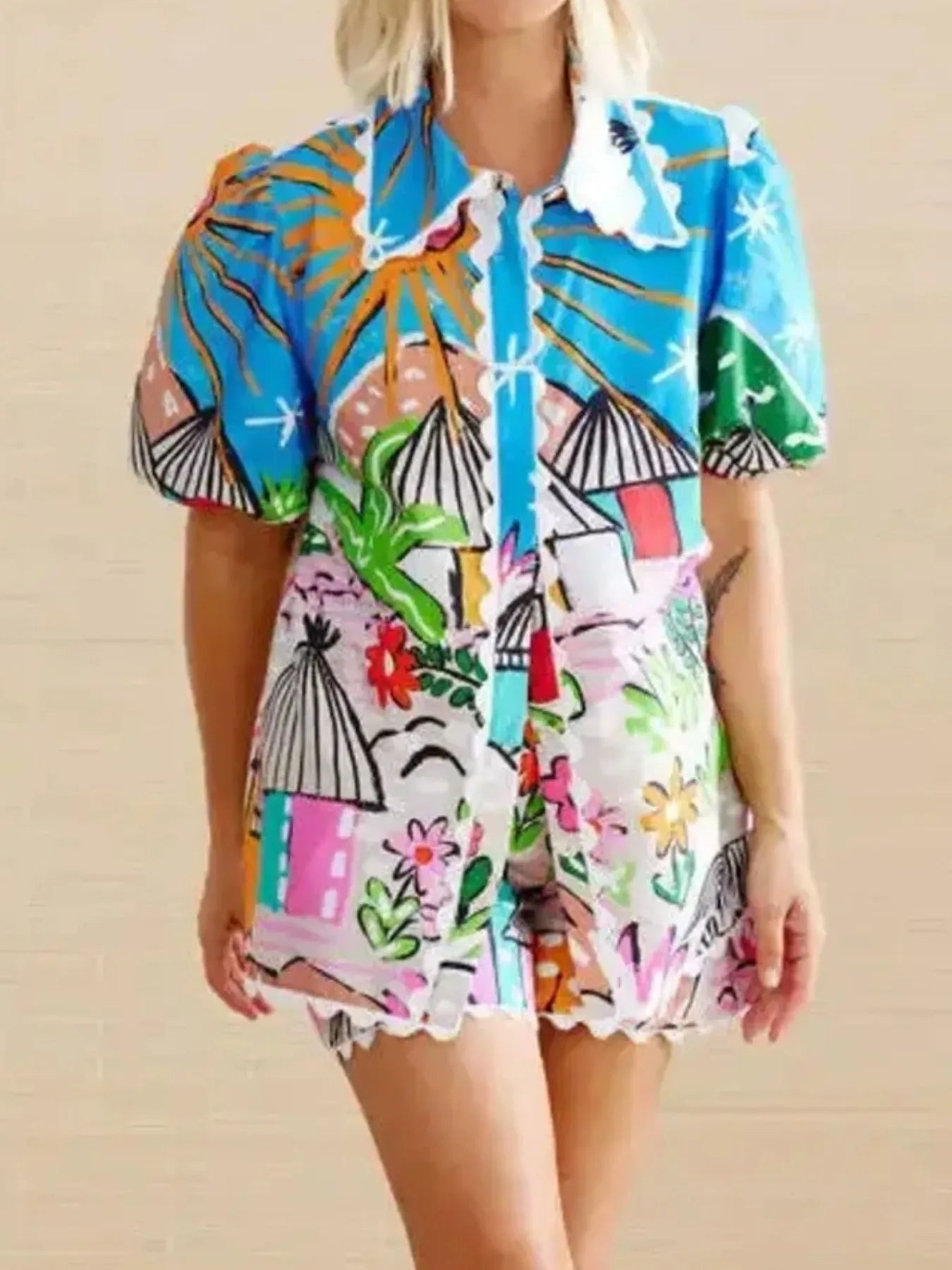 Button Up Puff Sleeve Shirt and Shorts Set DJPT
