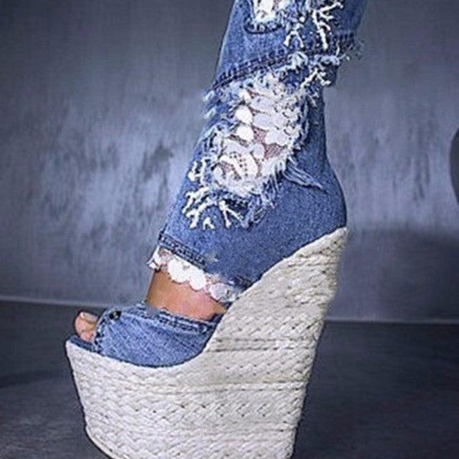 Cowboy Splicing Long Boots Women Summer Cold Boots Fish Mouth Fine Heel High Heels Thin Skinned Single Lady Sandals High Quality Shoes
