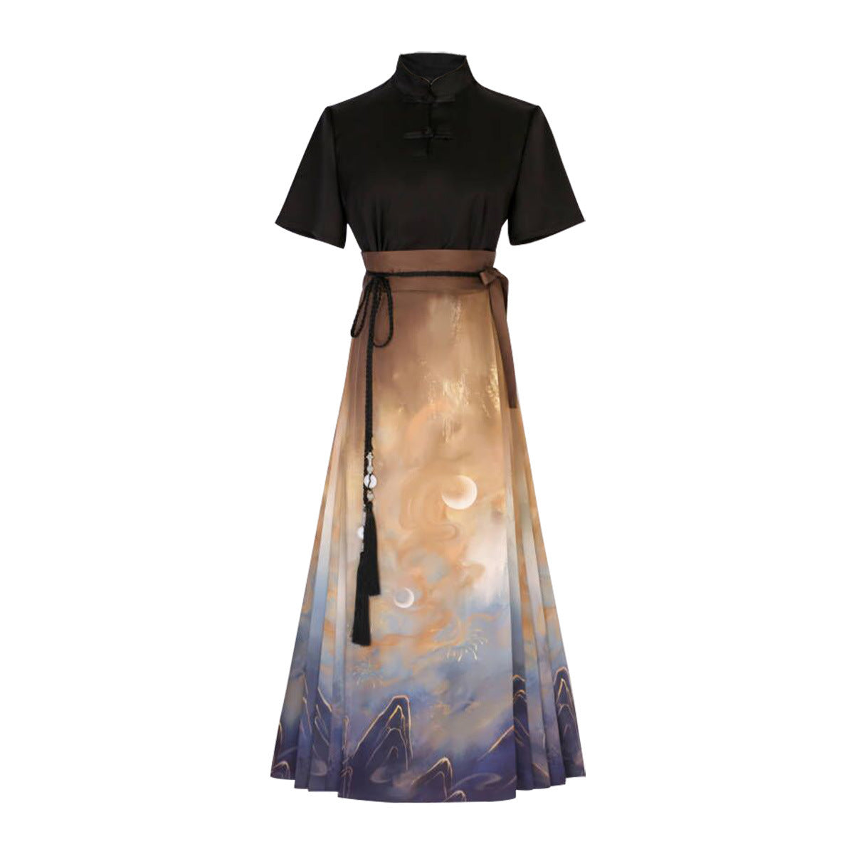 Design Blazed Gold Chinese Style Improvement Han Element Women's Short-Sleeved Top Skirt Dress Set 7065