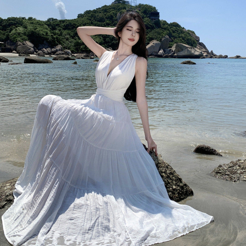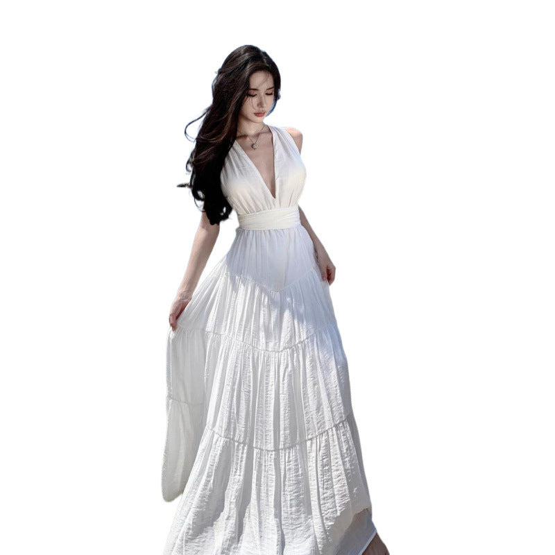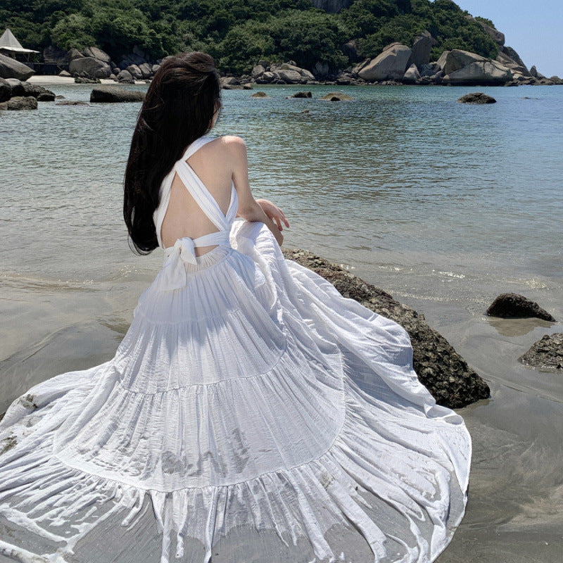 Dress 2024 New Sanya Hanging Neck Dress Sexy Bare Back White Sling Dress Holiday Dress