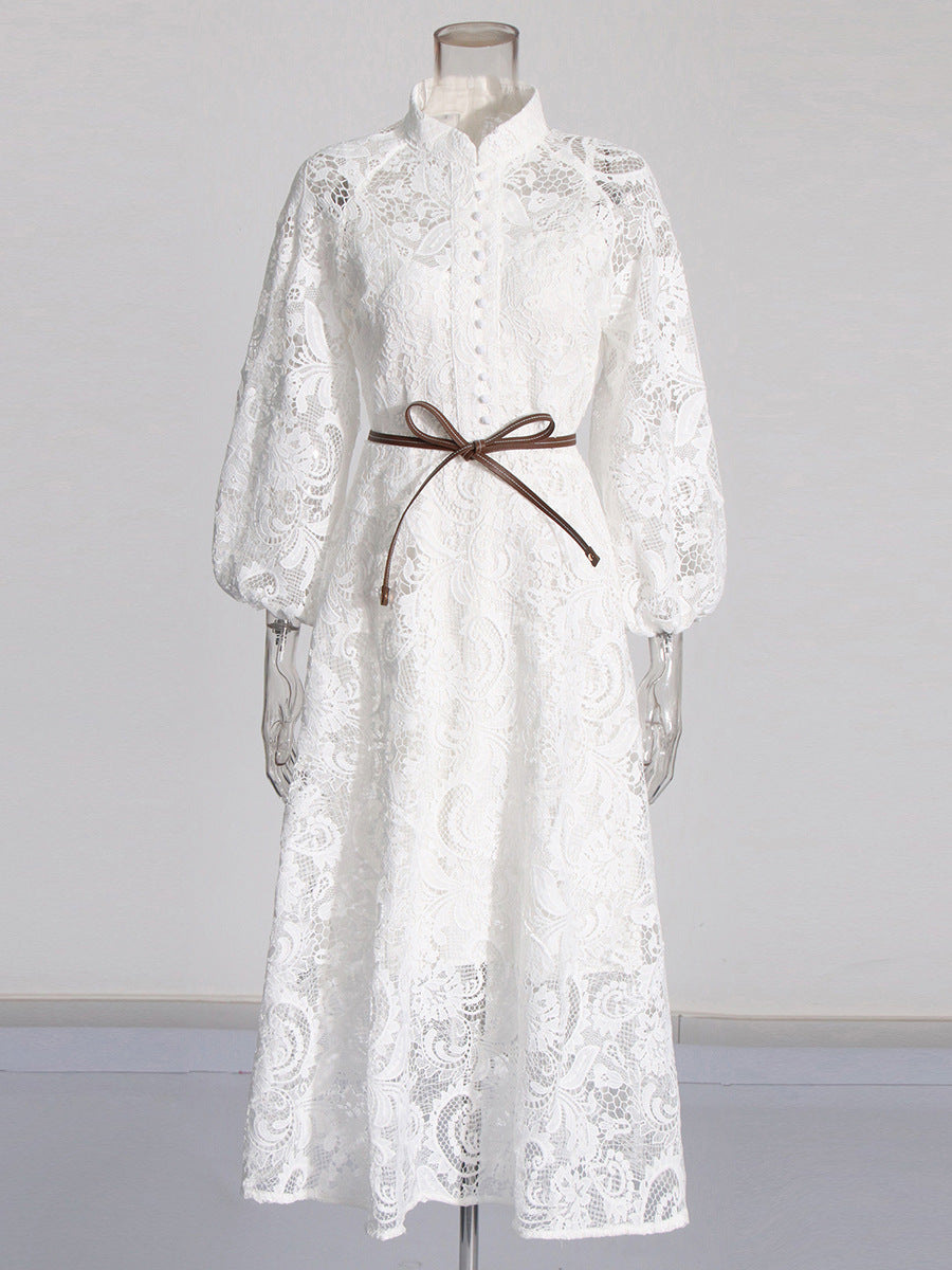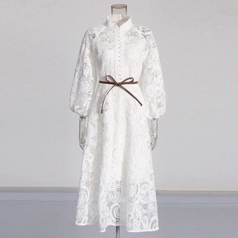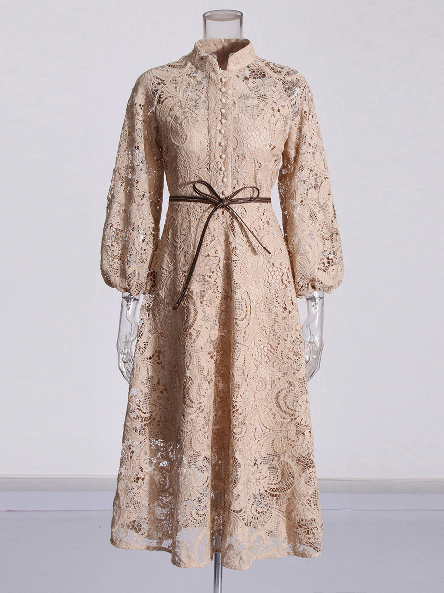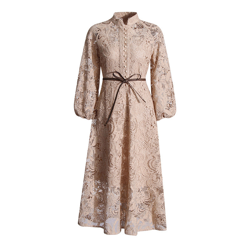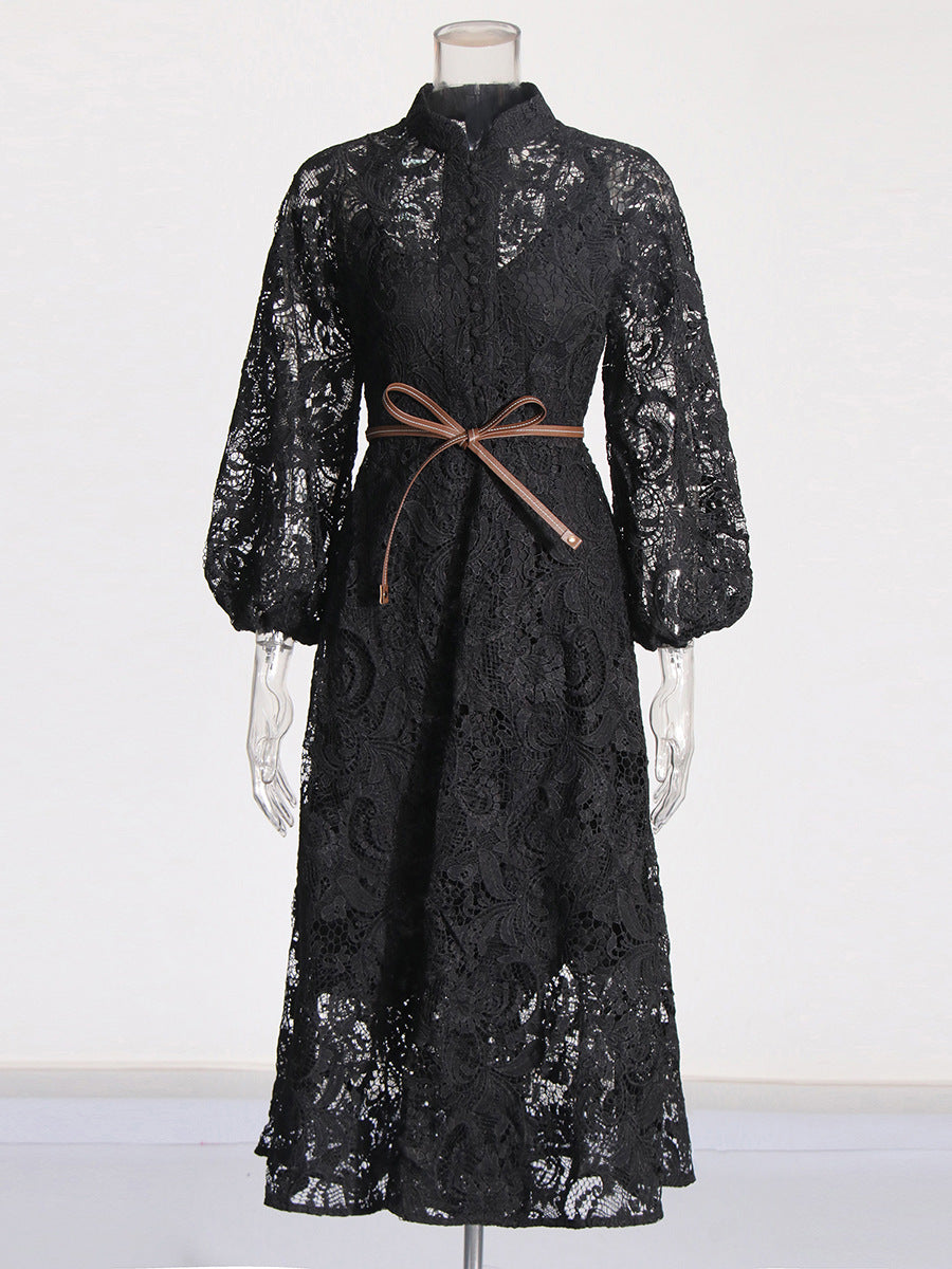 Elegant Retro Style Dress Woman 2025 Spring High-End Heavy Industry Lace Hollow Waist Dress