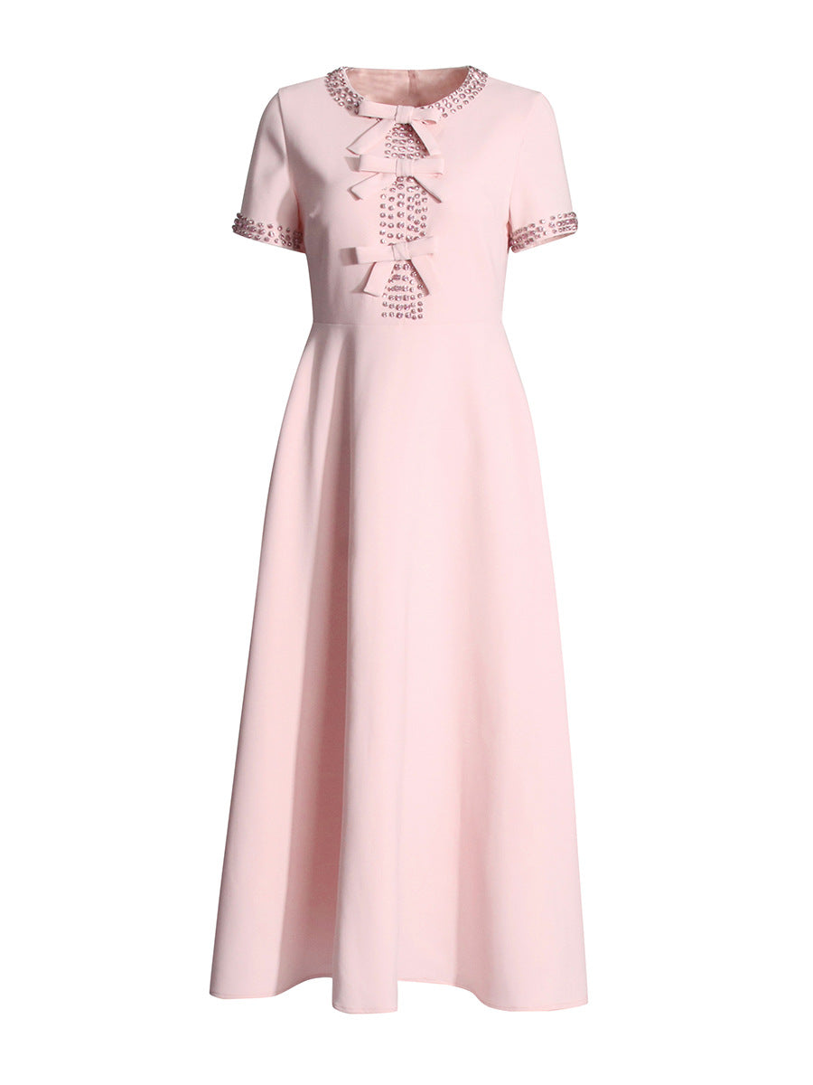 Elegant Style Dress 2025 Summer New Round Neck Heavy Industry Nail Drill Splicing Bow Dress Woman
