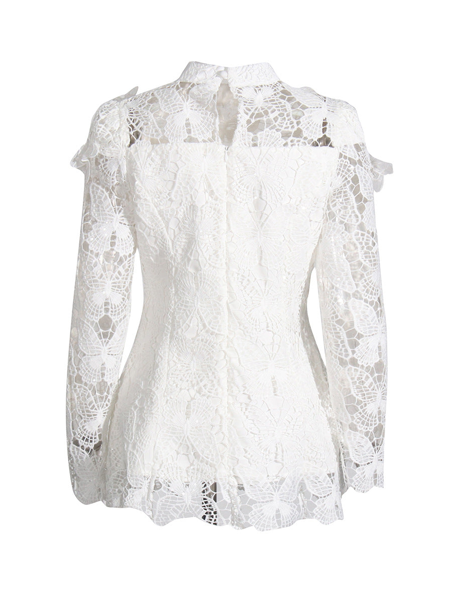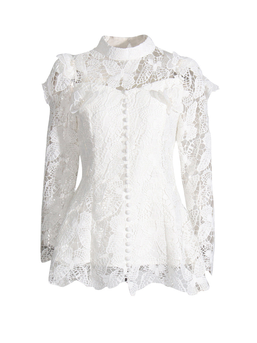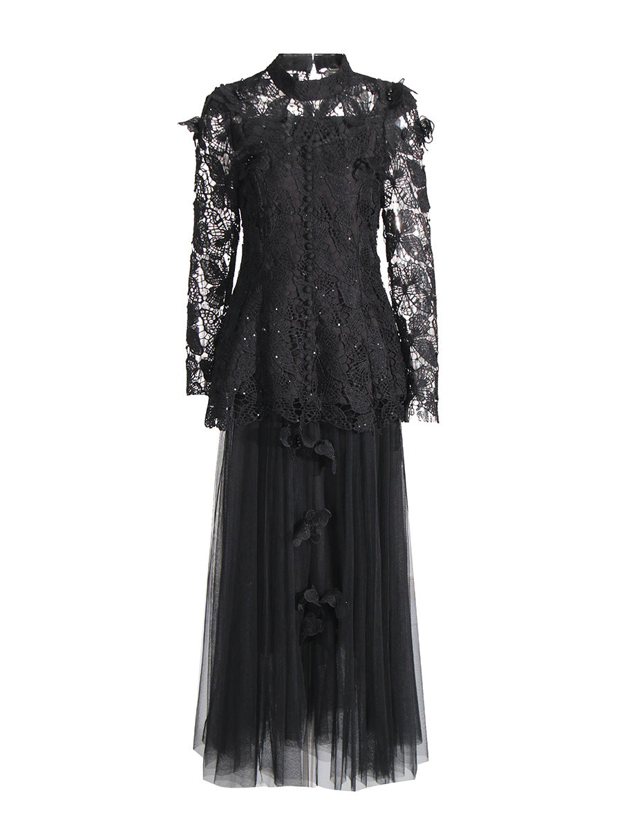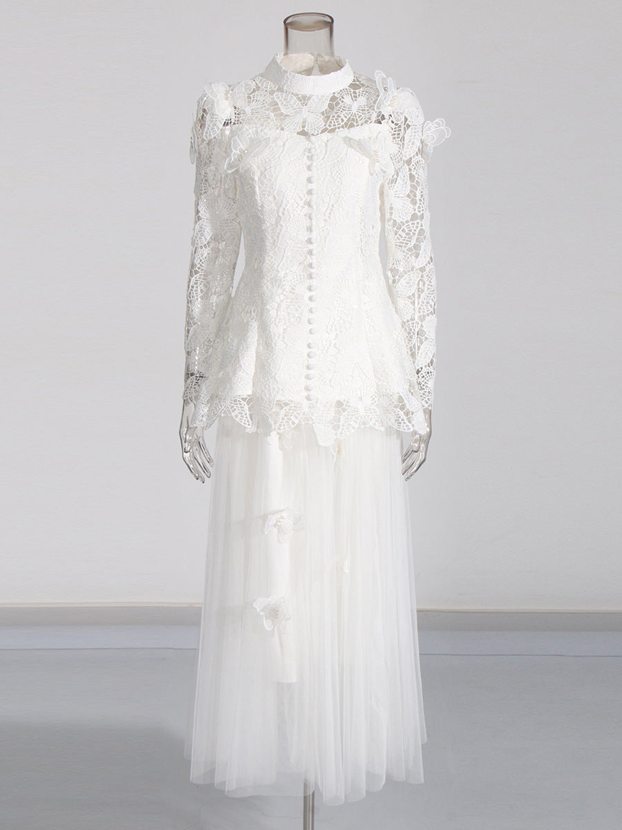 Famous Wind 2025 New Heavy Industry Embroidered Water-Soluble Flower Single Buckle Top + Folded Skirt Dress Suit Woman