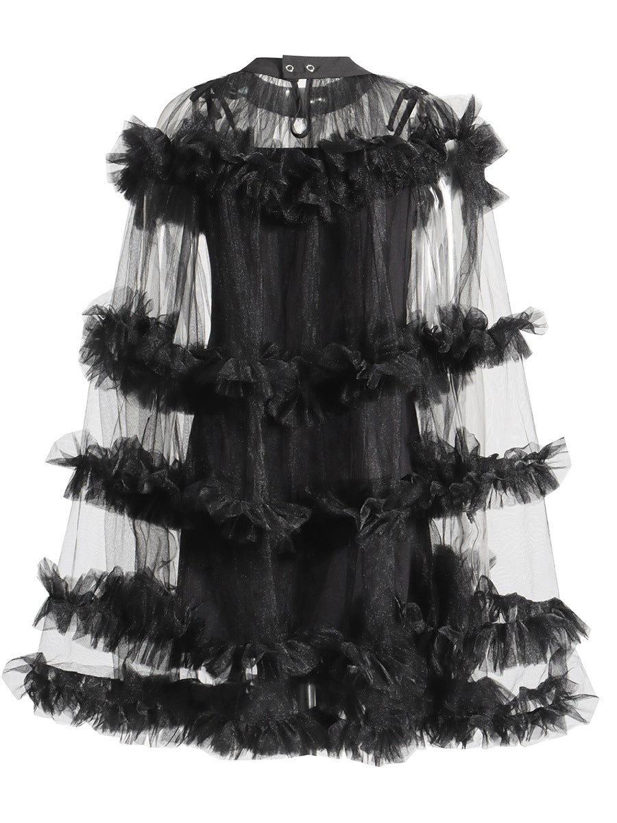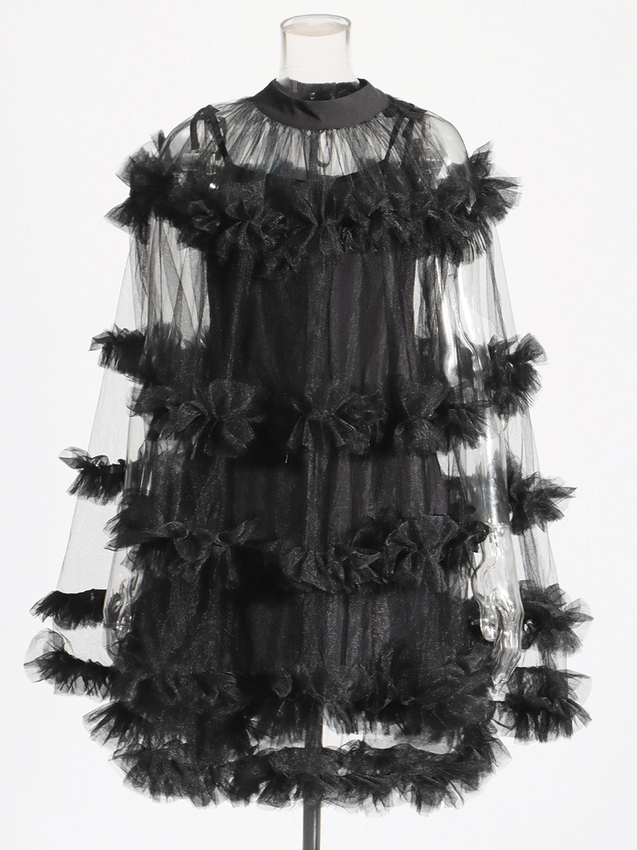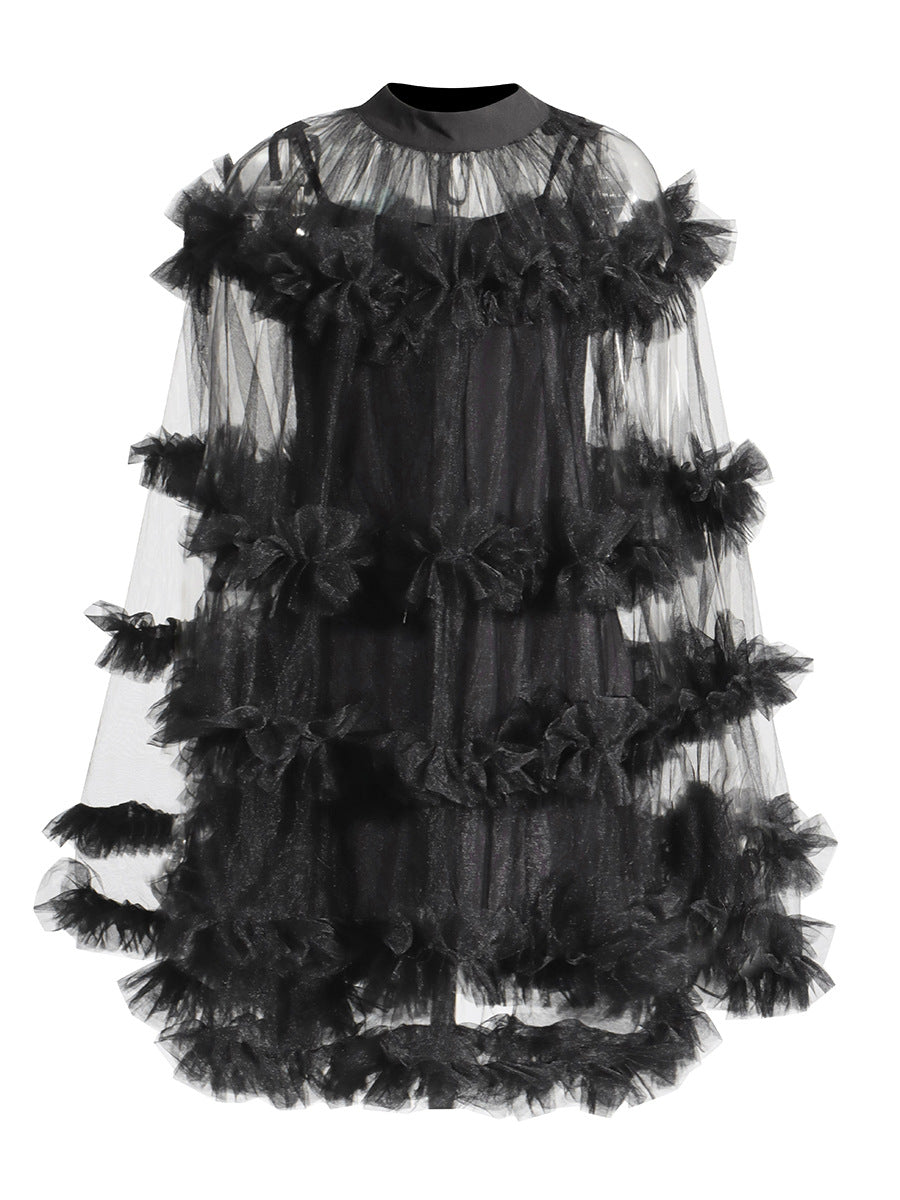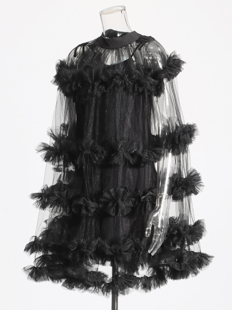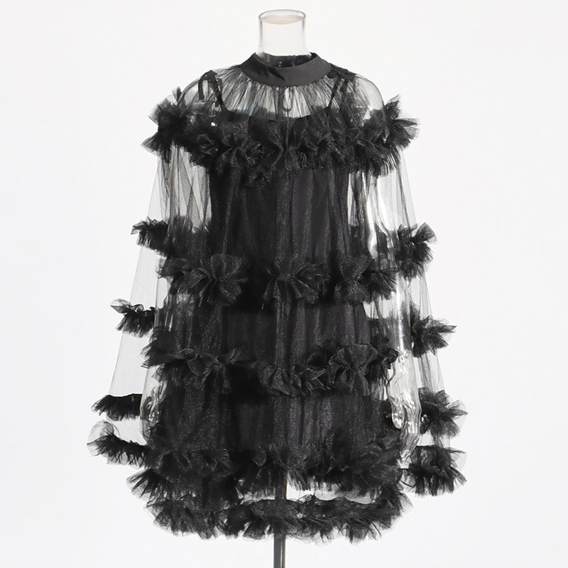 Famous Yuanfeng 2025 Summer New Round-Necked Long Sleeve Net Yarn Perspective Wood-Eared Splicing Design Dress Dress Woman
