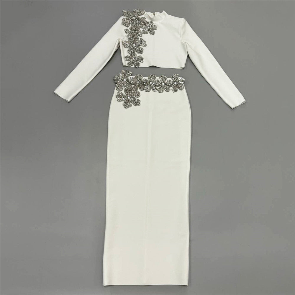 Fashion Diamond-Staggered Bandage Skirt Set Long Sleeve Half-Necked Short Blouse Dress Two-Sleeve Woman