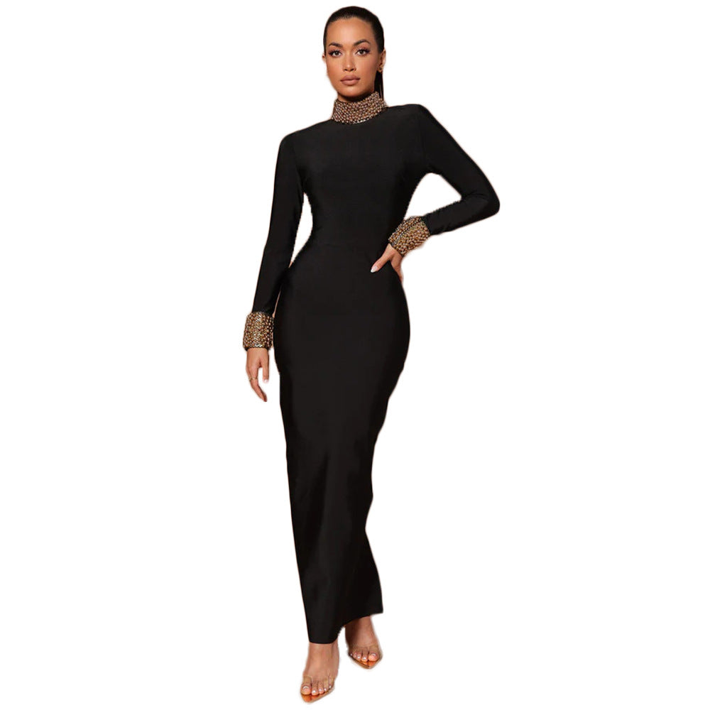 Fashion Diamond-Studded Nail-Peared Long-Sleeved Banded Dress Sexy Dew Party Party Dress Dress