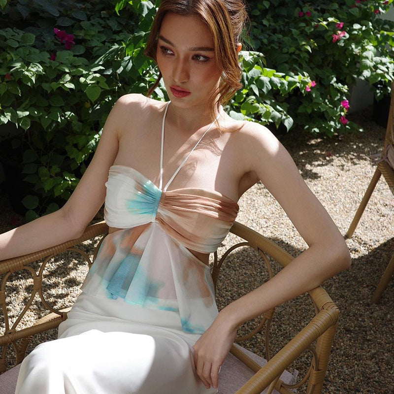 Fashion Print Hanging Neck Corset 2025 Autumn New Folding Folding T-Shirt DJPT